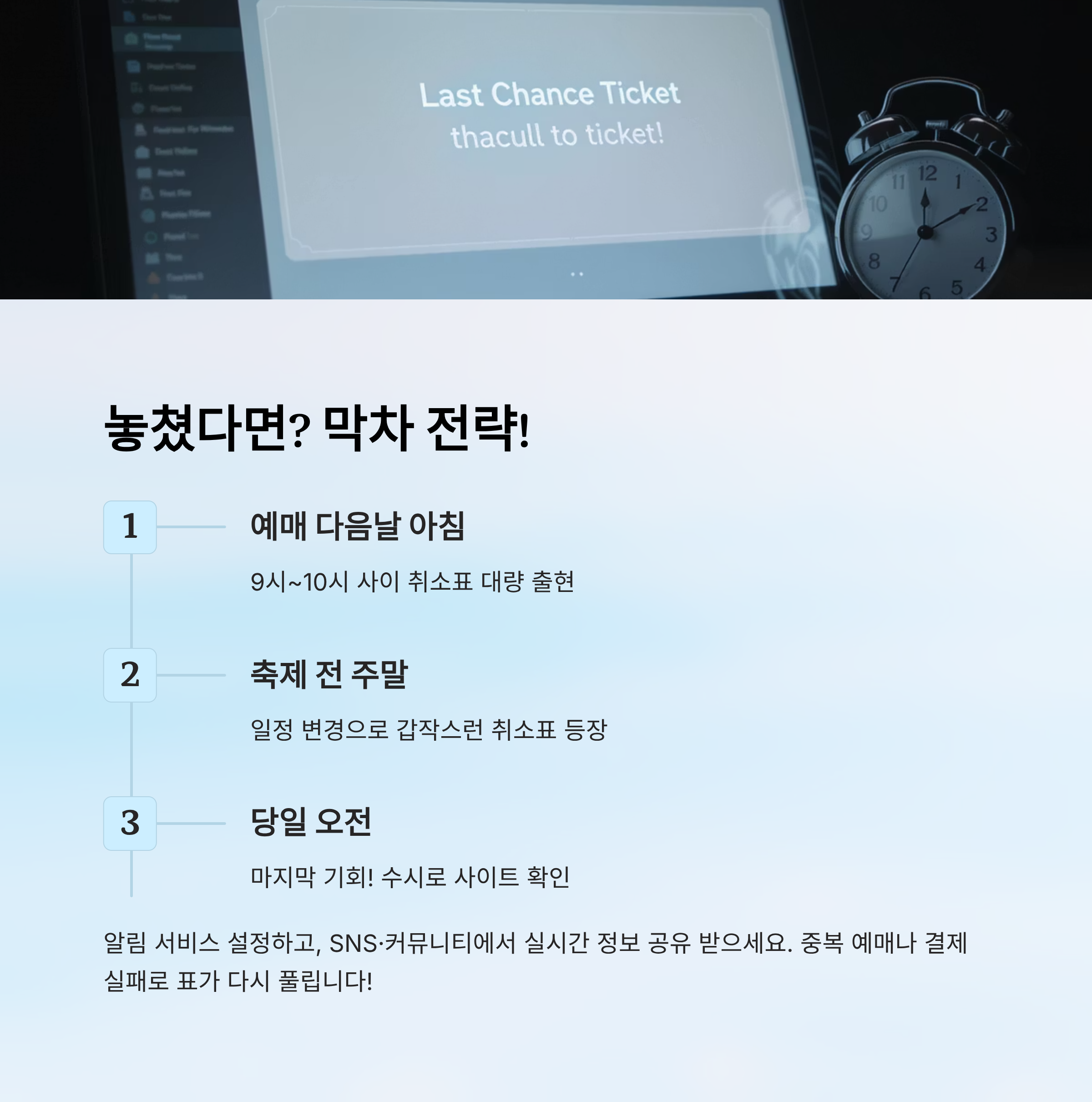 티켓을 놓쳤더라도 아직 기회는 있어요! 많은 사람들이 예매 후 일정 변경, 중복 예매, 결제 실패 등으로 취소표를 다시 등록하게 되거든요. 이런 걸 노리는 게 바로 ‘막차 전략’이에요. 🚂