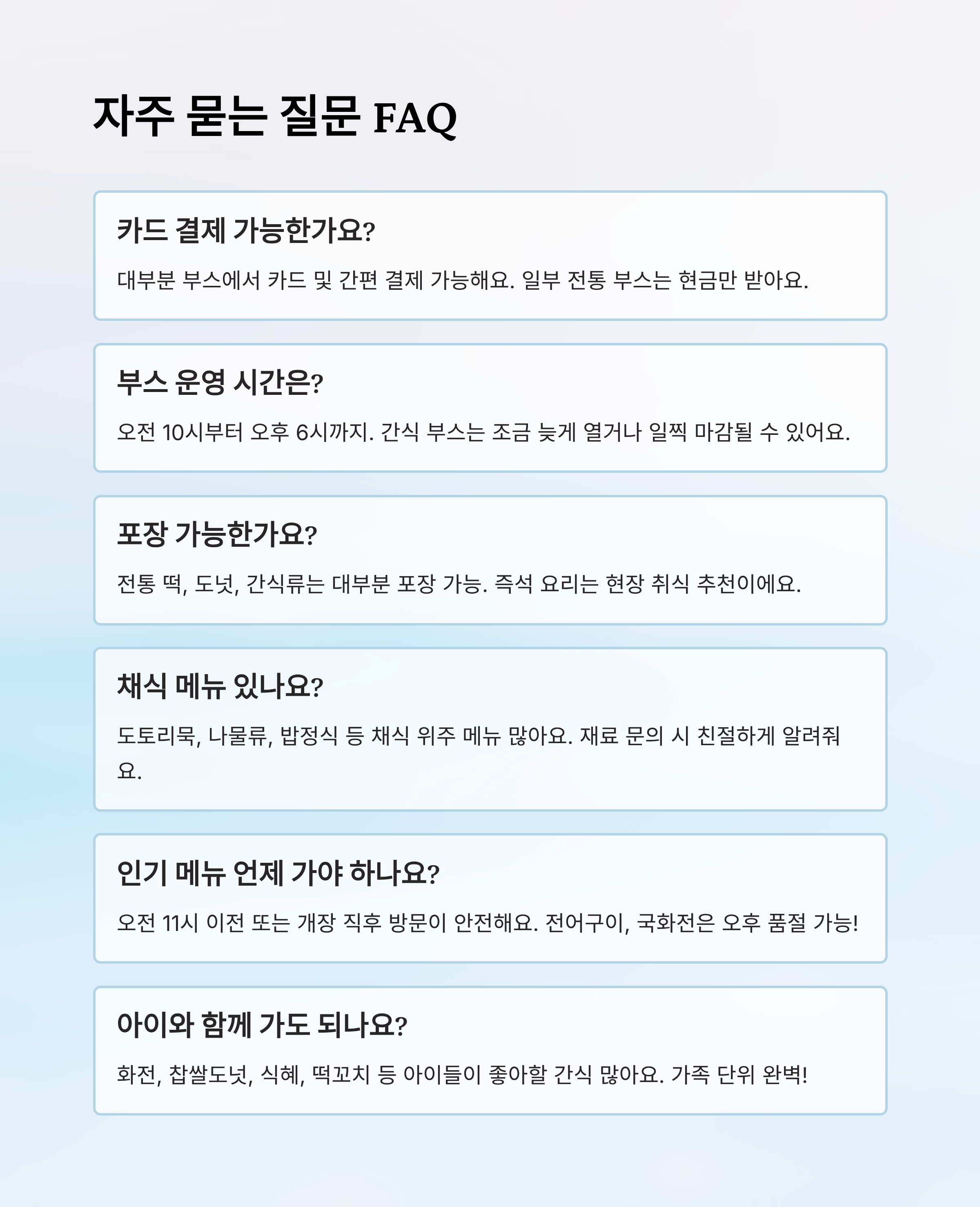 A6. 물론이에요! 화전, 찹쌀도넛, 식혜, 떡꼬치, 어묵 등 아이들이 좋아할 간식이 많고 맵거나 자극적인 음식은 거의 없어요. 가족 단위 방문객에게도 안성맞춤이에요.