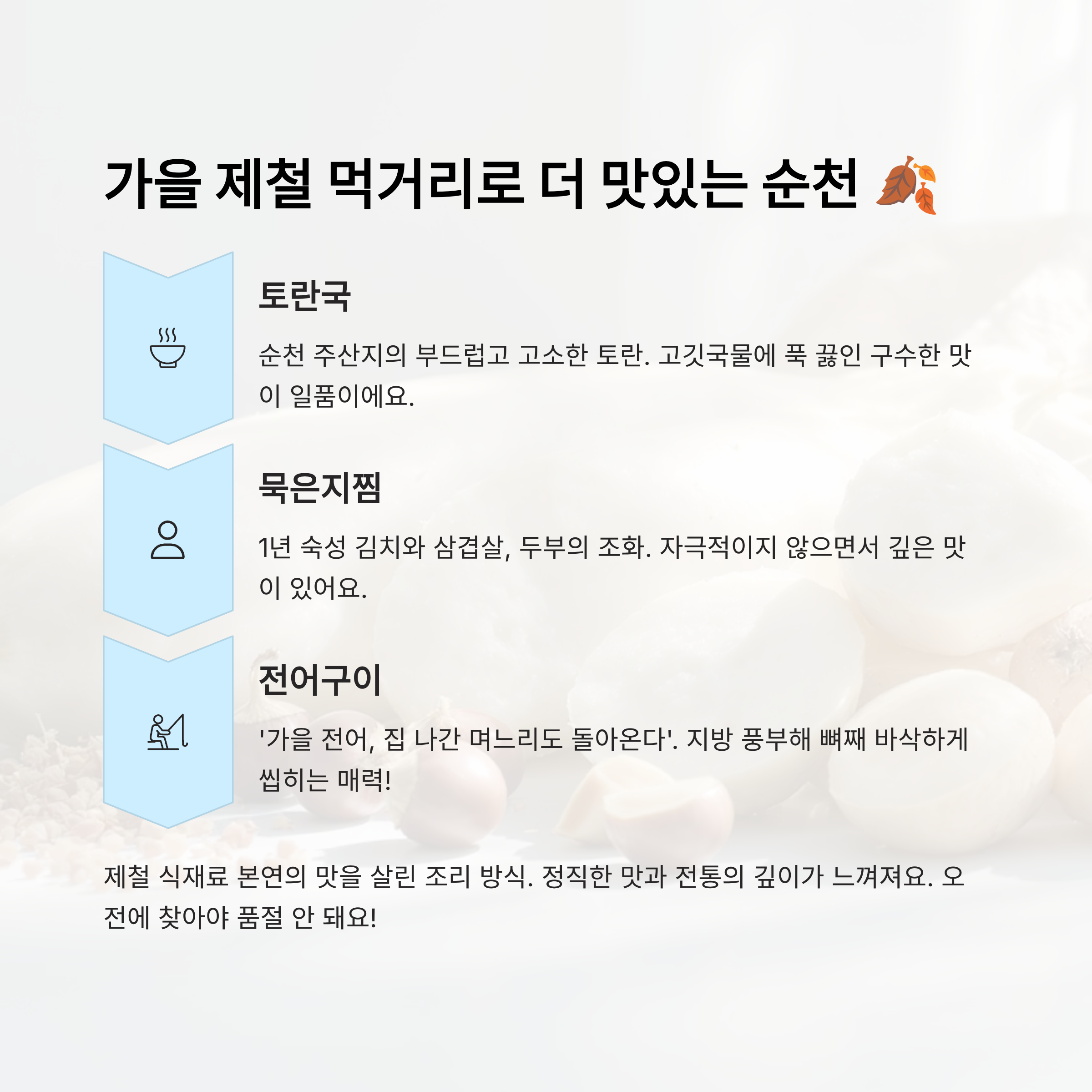 순천은 먹거리 천국이에요. 축제장에서 하루 종일 놀고 나면 근처 로컬 맛집에서 따끈한 한 끼로 마무리해보세요. 이번엔 계절별 제철 음식 이야기도 한번 들어볼까요? 🎃🍂