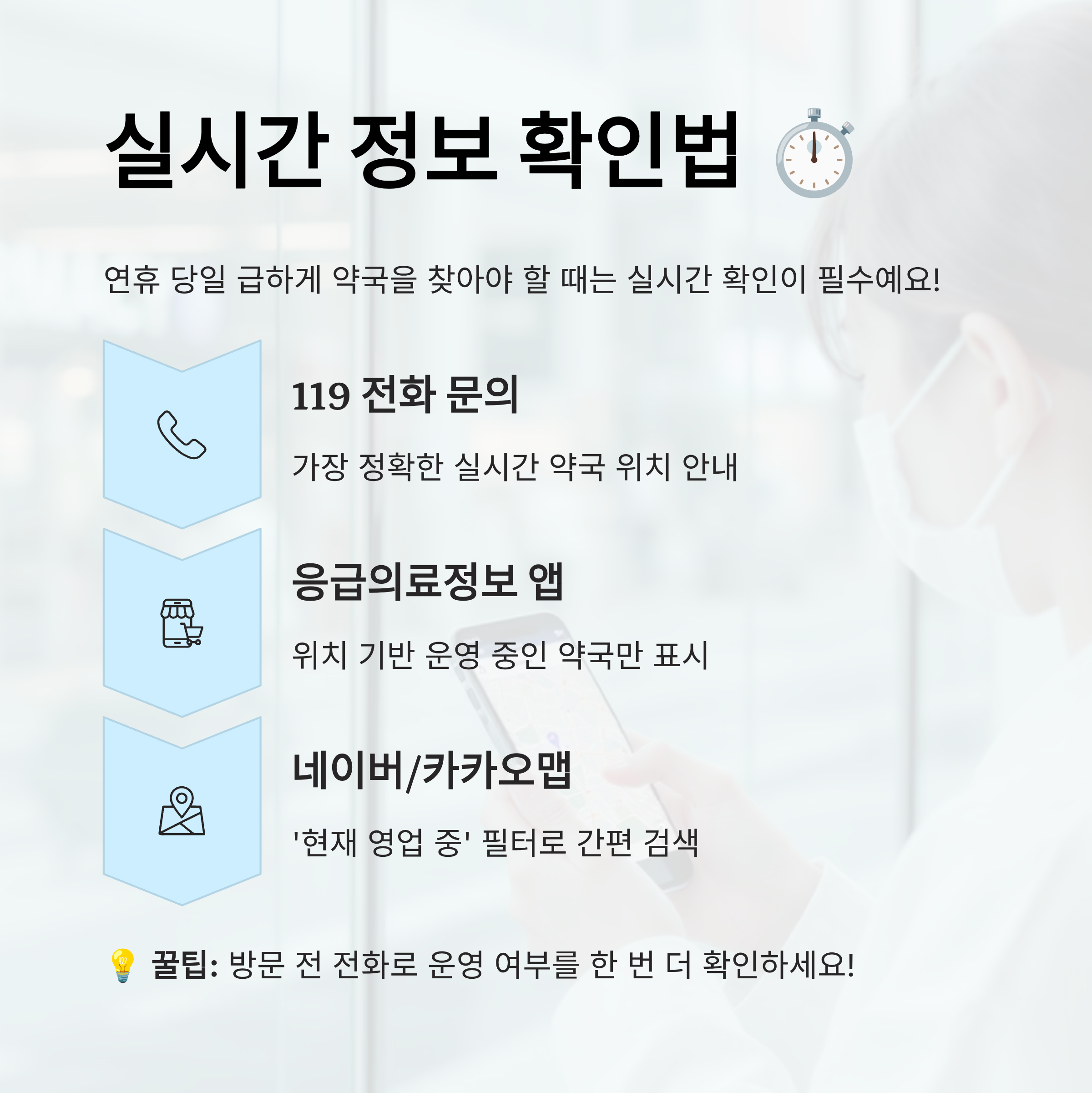 연휴 당일, 혹은 전날 밤 급하게 약국을 찾아야 할 때는 **실시간 정보 확인**이 가장 중요해요. 이유는 단 하나! "계획은 좋았지만, 실제는 다를 수 있기 때문"이죠. 😬