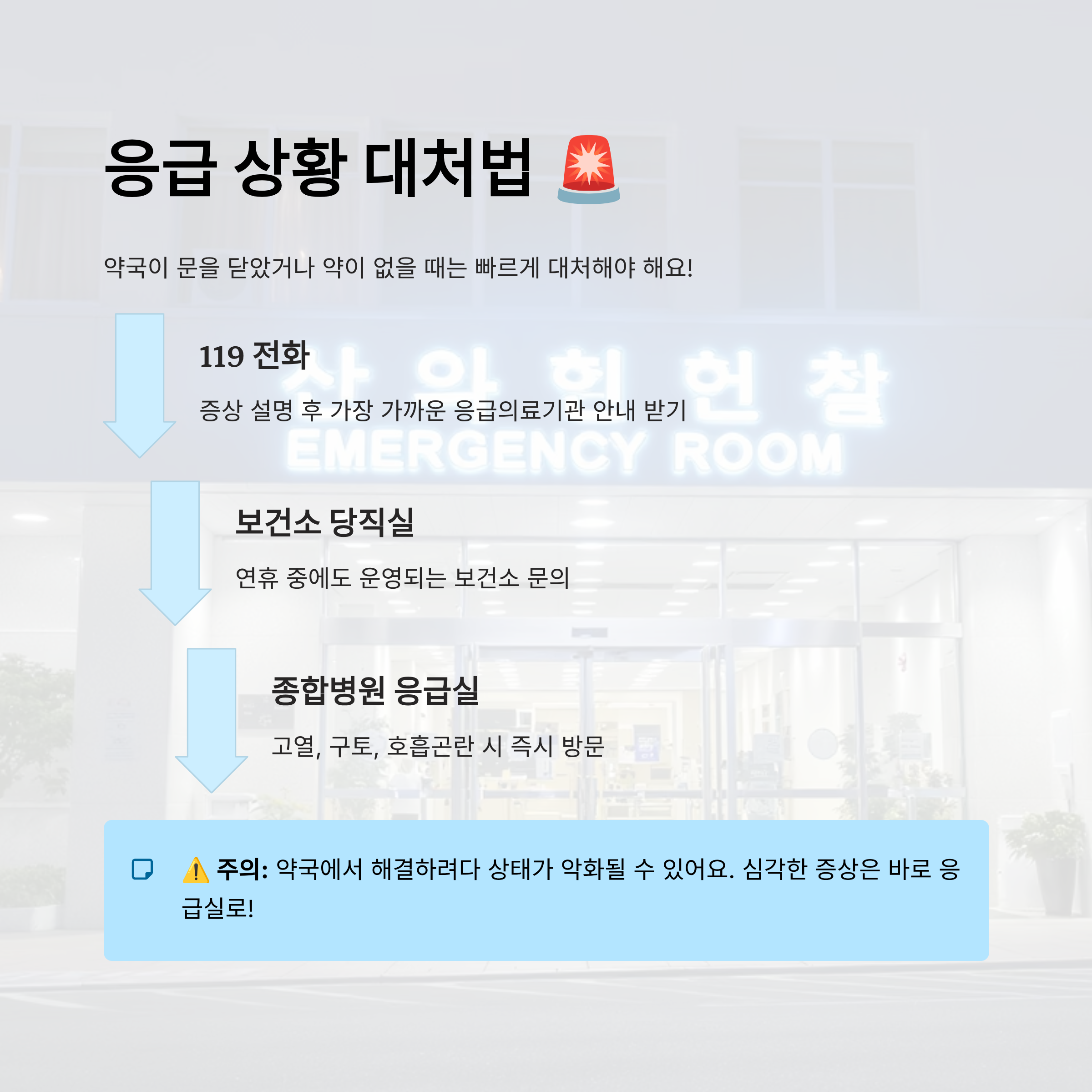 약국 문이 닫아있거나 약이 없는 응급 상황에서는 빠르게 병원을 찾아야 해요. 이럴 땐 **119**, **E-gen**, **응급의료정보제공 앱**이 가장 빠르고 정확하답니다.
