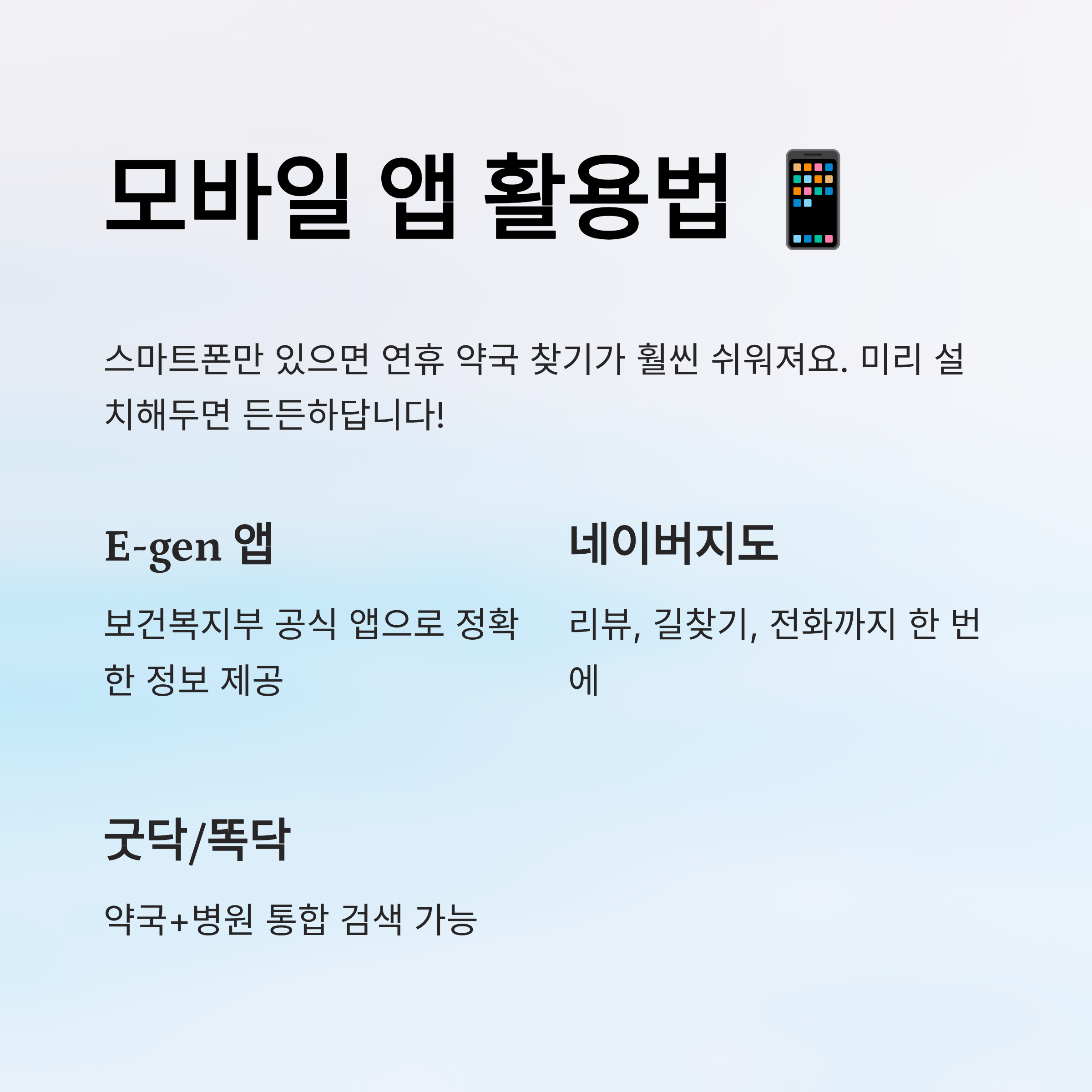 요즘은 스마트폰만 있으면 연휴에도 약국 찾기가 훨씬 쉬워졌어요. 특히 연휴에 갑자기 아프거나 약이 필요한 경우, 모바일 앱이 큰 힘이 돼요.