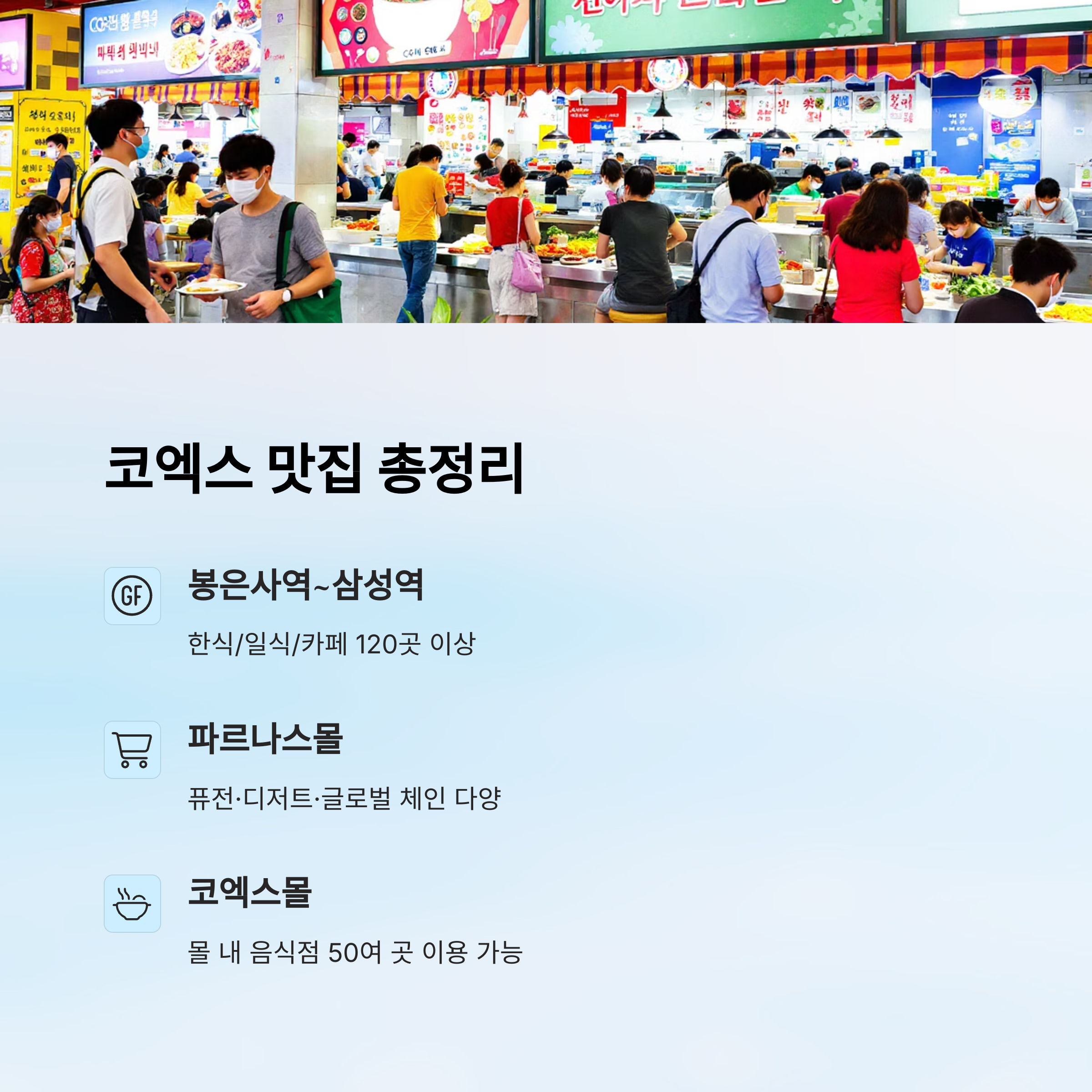 코엑스 주변 맛집은 정말 많지만, 페스티벌 날은 ‘빠르게, 든든하게’가 핵심이에요. 오픈런 후 체력 회복용 점심부터 굿즈 정리하며 들를 수 있는 카페까지! 덕후 취향 제대로 반영했어요. 🍜