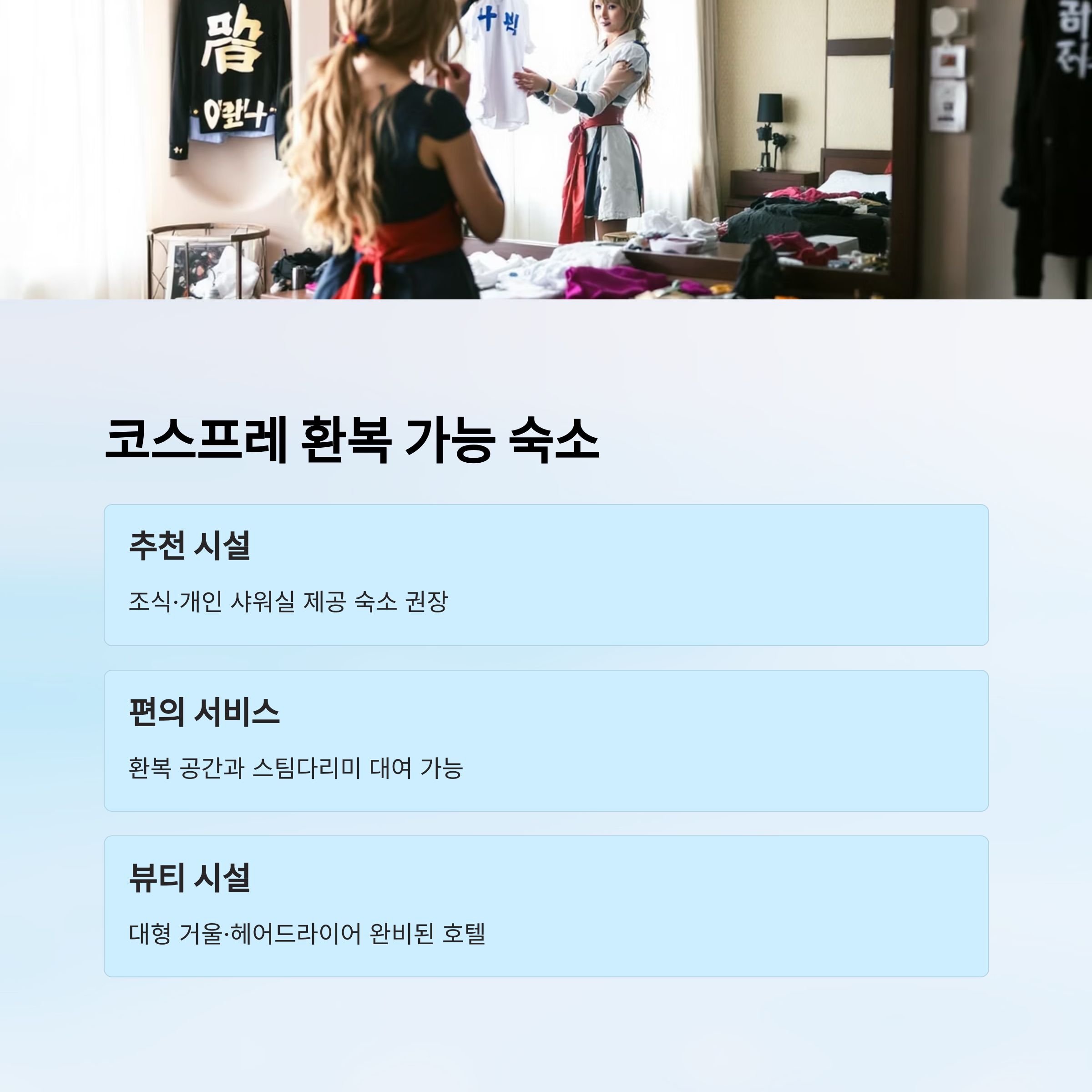 이세계 페스티벌 하면 뭐다? 바로 코스프레! 👗✨ 그런데 부스나 행사장에서 바로 갈아입기엔 너무 힘들고 민망할 수 있어요. 그래서 ‘환복 가능한 숙소’를 미리 잡는 게 핵심이에요!