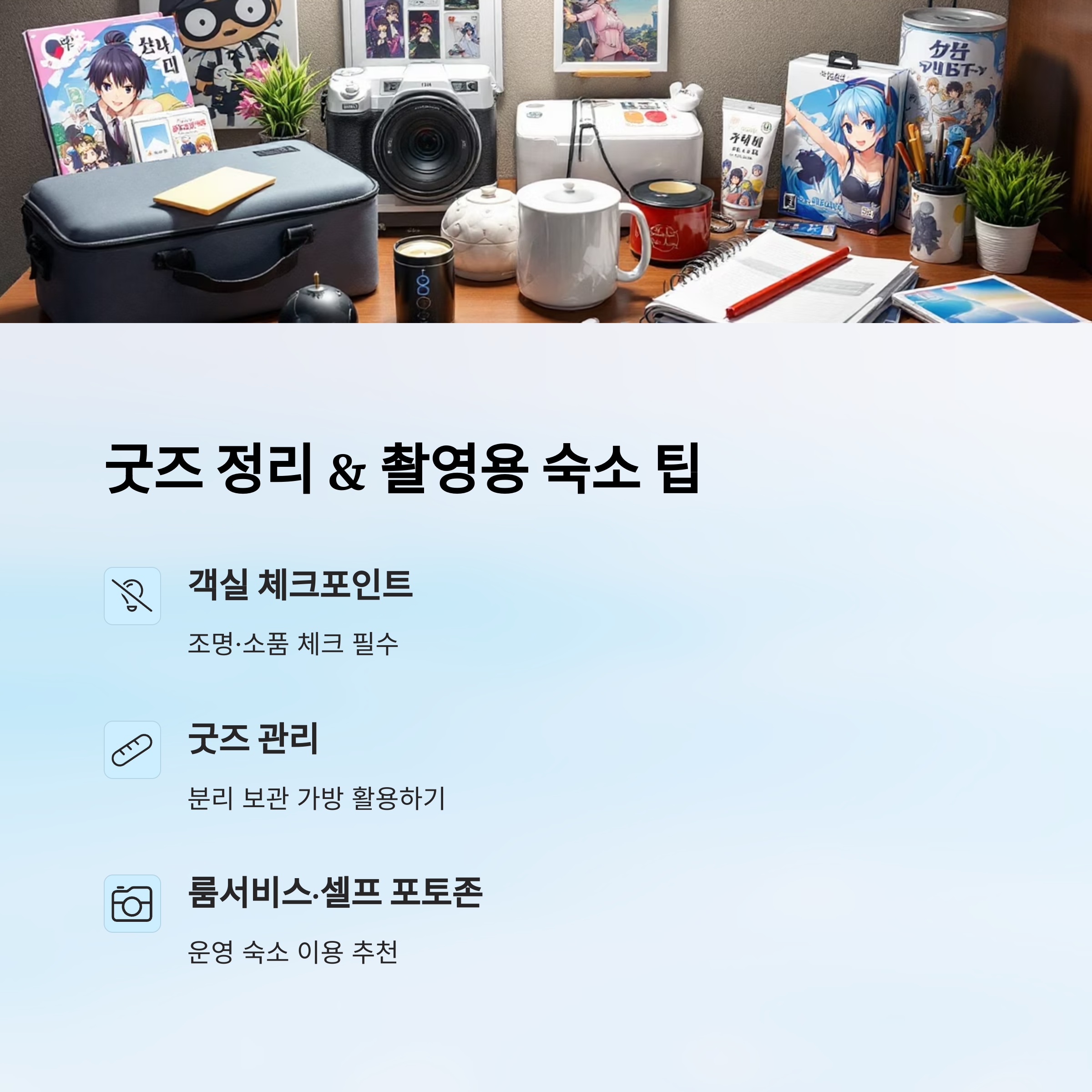 🎁 굿즈 정리 & 촬영용 숙소 팁