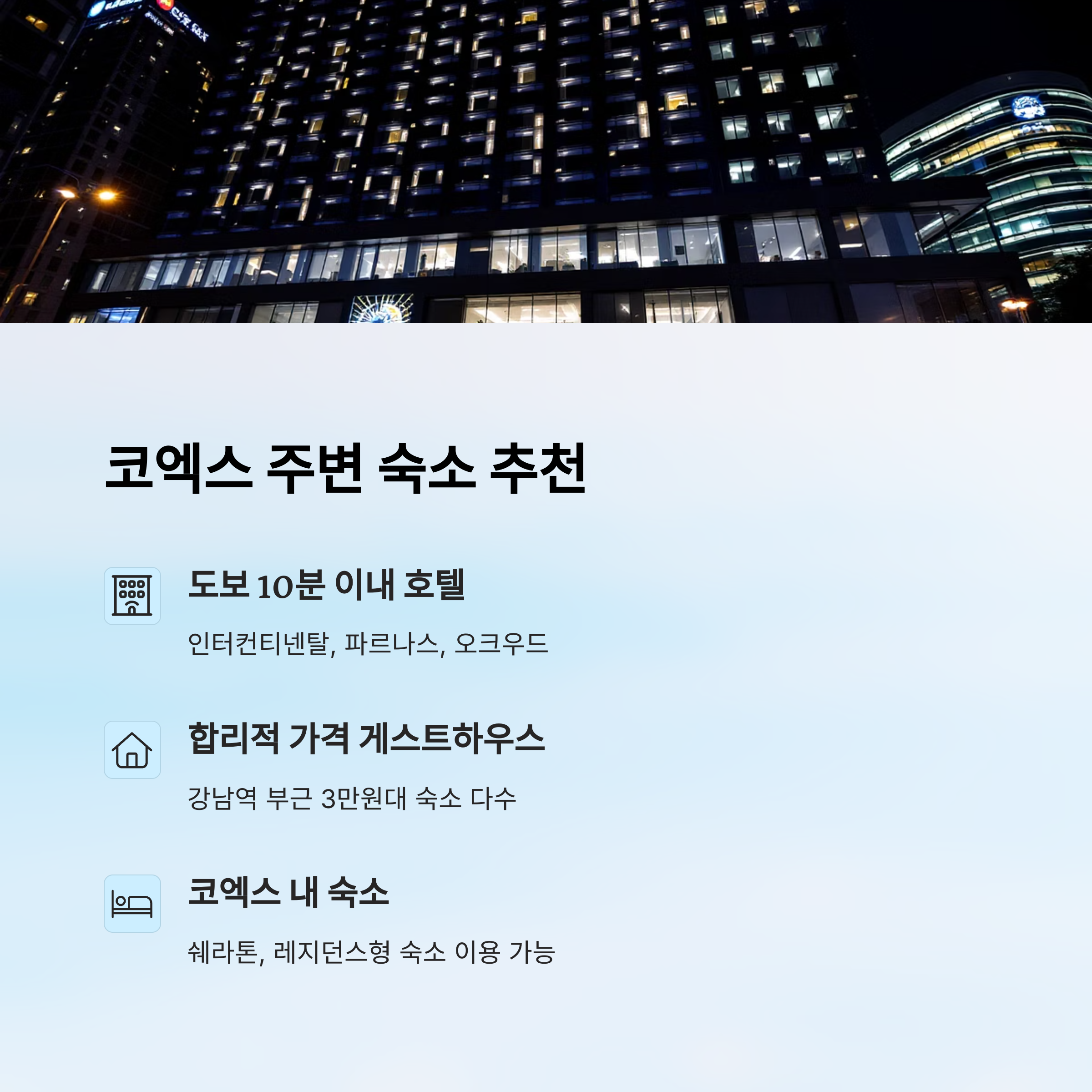 서울 코엑스에서 열리는 이세계 페스티벌에 참여할 예정이라면, 도보로 이동 가능한 숙소는 덕후들의 진정한 베이스캠프예요. 굿즈 구매 줄도 길고, 코스튬으로 이동하기도 쉽지 않기 때문에 근처 숙소는 필수랍니다.