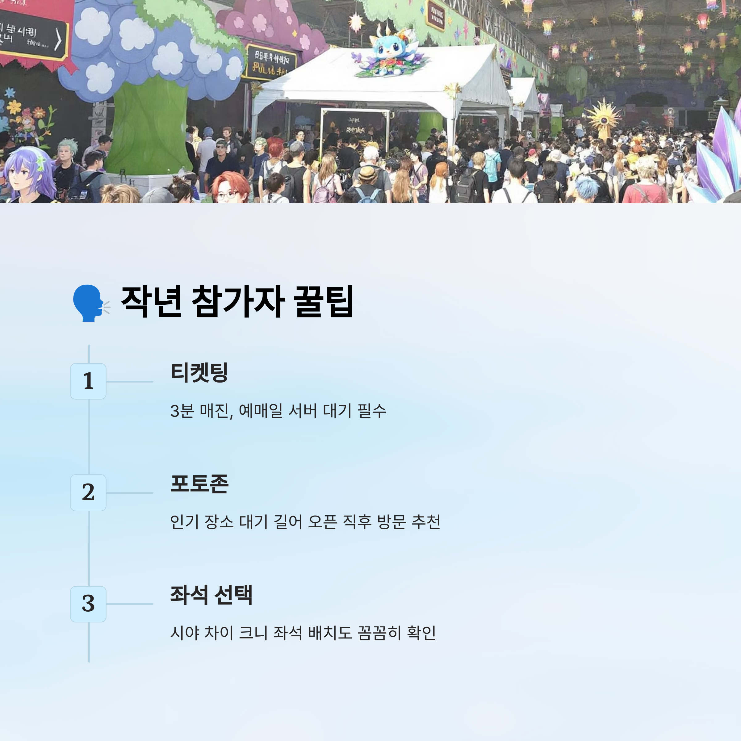 두 번째로 많이 언급된 건 굿즈 공략법이에요. 인기 부스는 개장 1시간 만에 품절되기도 했기 때문에, 반드시 가고 싶은 부스를 정해 두고 행사장 입장 직후 바로 달려가는 게 좋아요. 작년엔 특히 아크릴 스탠드랑 한정 피규어가 가장 빨리 동났어요. 😱