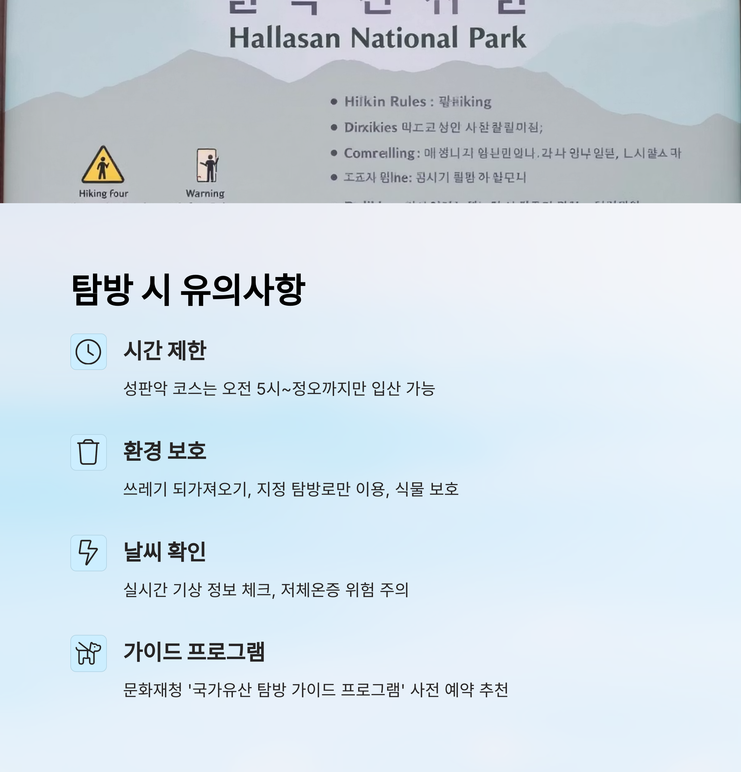 한라산 탐방은 국가공원 보호구역이기 때문에 몇 가지 규칙을 꼭 지켜야 해요. 먼저, 지정된 탐방 시간 외 입산은 금지예요. 성판악 코스의 경우 오전 5시~정오까지만 입산이 가능해요. 이를 넘기면 입구에서 출입을 막는답니다.