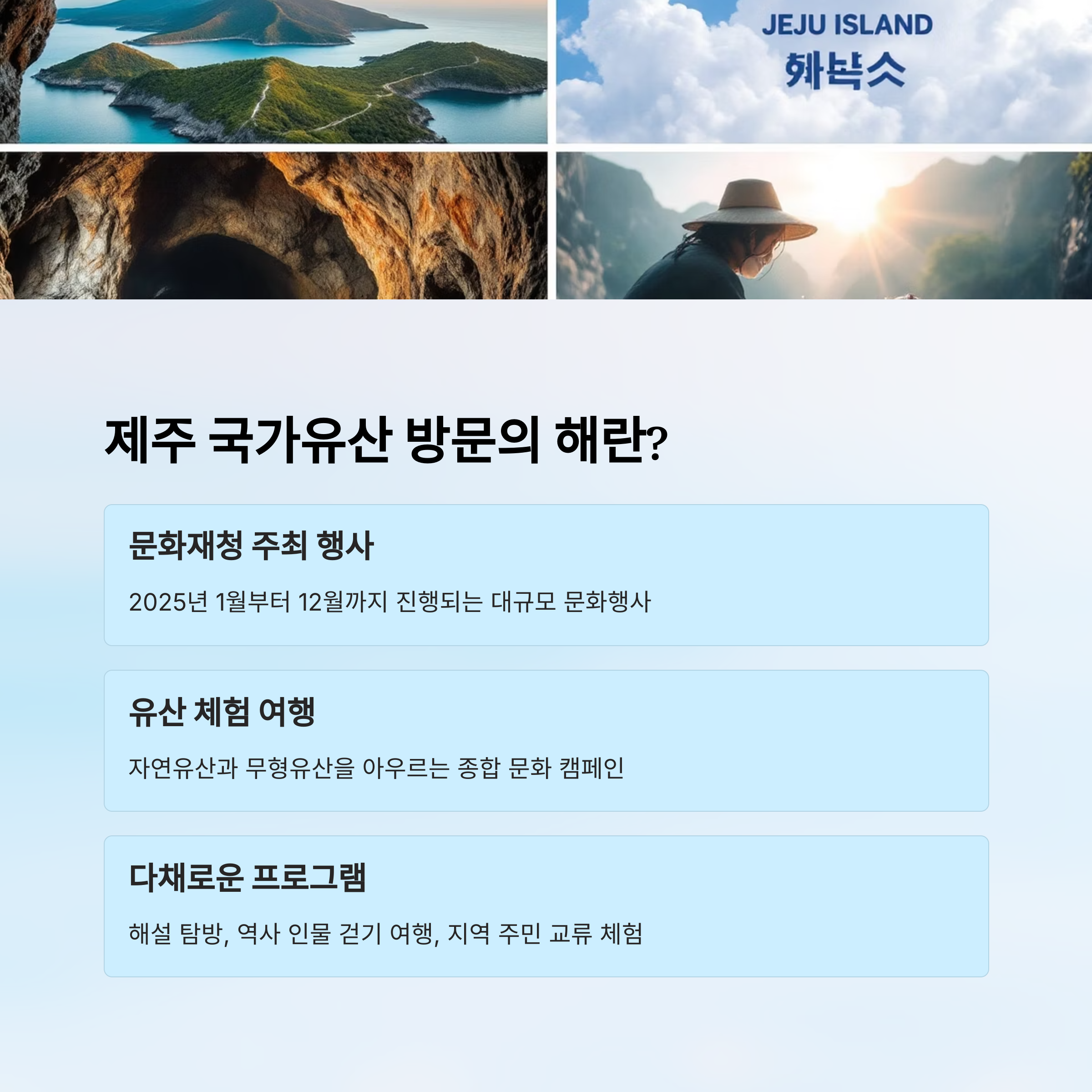 ‘2025 제주 국가유산 방문의 해’는 문화재청과 제주특별자치도가 공동 주최하는 대규모 문화행사예요. 이 행사는 제주에 숨겨진 다양한 유형·무형 문화유산과 자연유산을 국내외 관광객들에게 소개하고, 제주만의 고유한 가치와 정체성을 널리 알리기 위해 마련됐답니다.