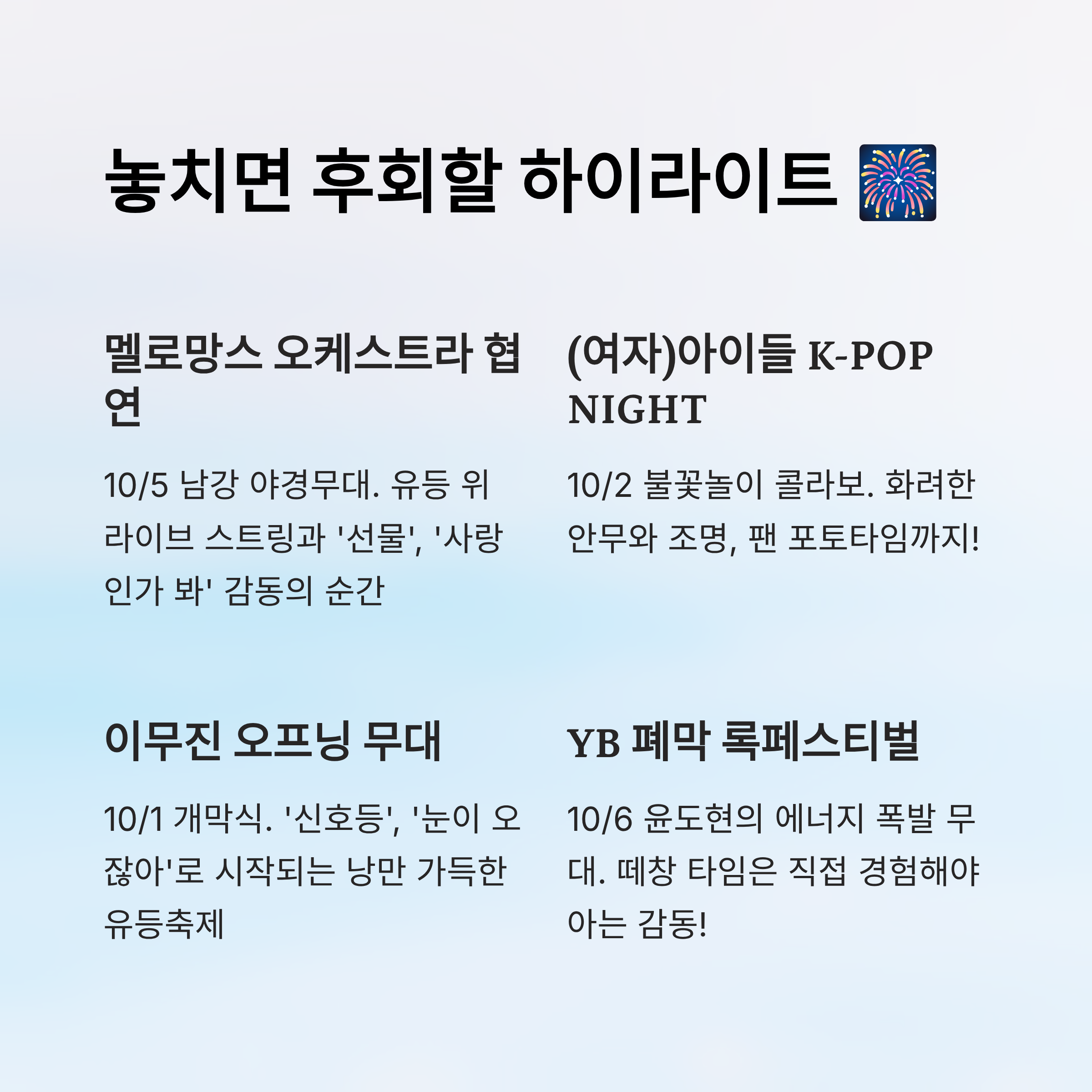 특히 10월 5일에는 불꽃놀이와 함께 열리는 스페셜 콜라보 무대도 기획되어 있어서, 멜로망스와 스트링 오케스트라의 라이브 퍼포먼스가 예정되어 있어요. 축제의 감동을 더해줄 순간이에요! ✨