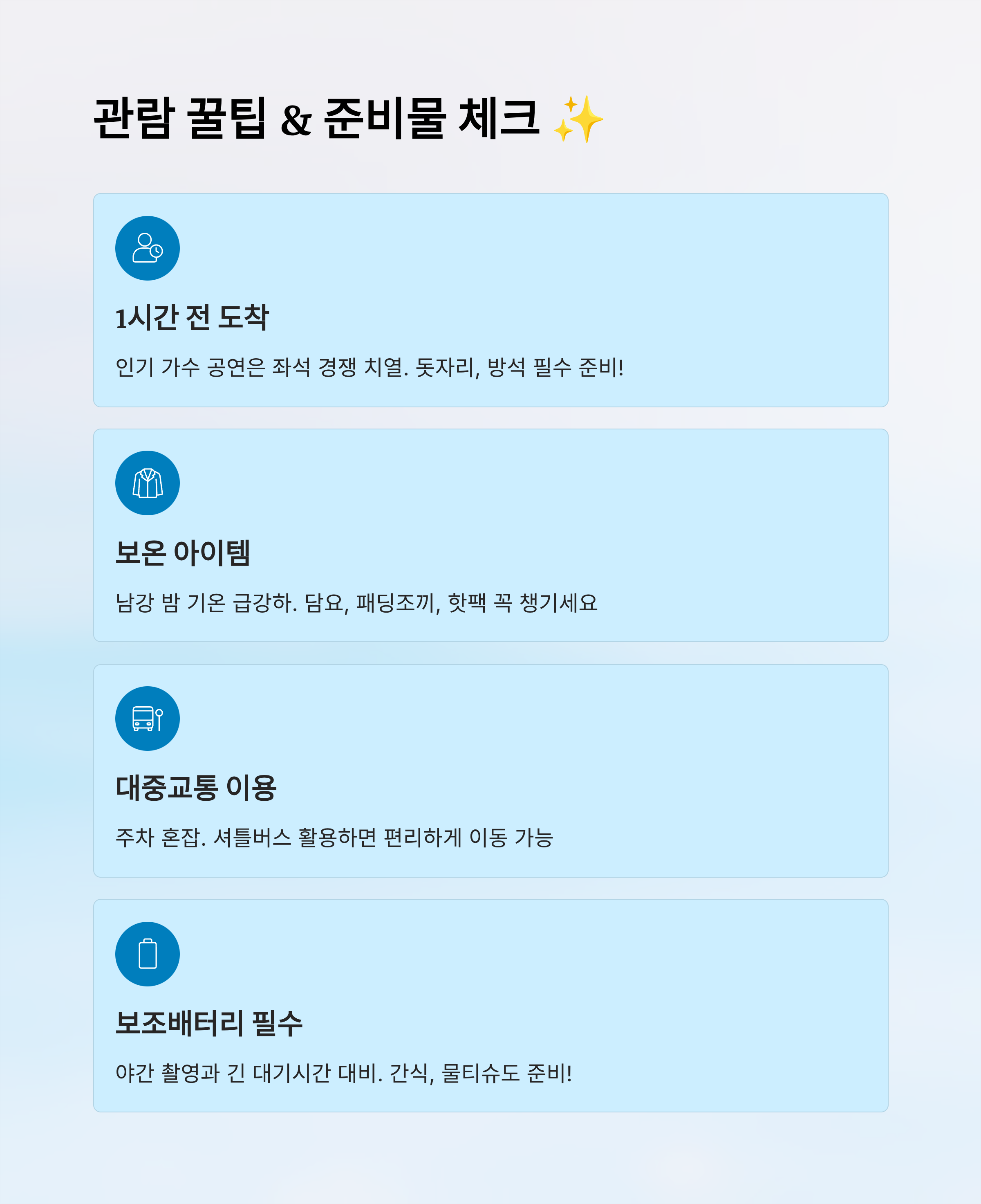 먼저 공연 시간보다 1시간 일찍 도착하는 게 좋아요. 특히 멜로망스, (여자)아이들 같은 인기 가수 공연은 관객이 엄청 많거든요. 돗자리, 휴대용 의자, 방석 같은 좌석 도구를 준비하면 편하게 관람할 수 있어요. 🎒
