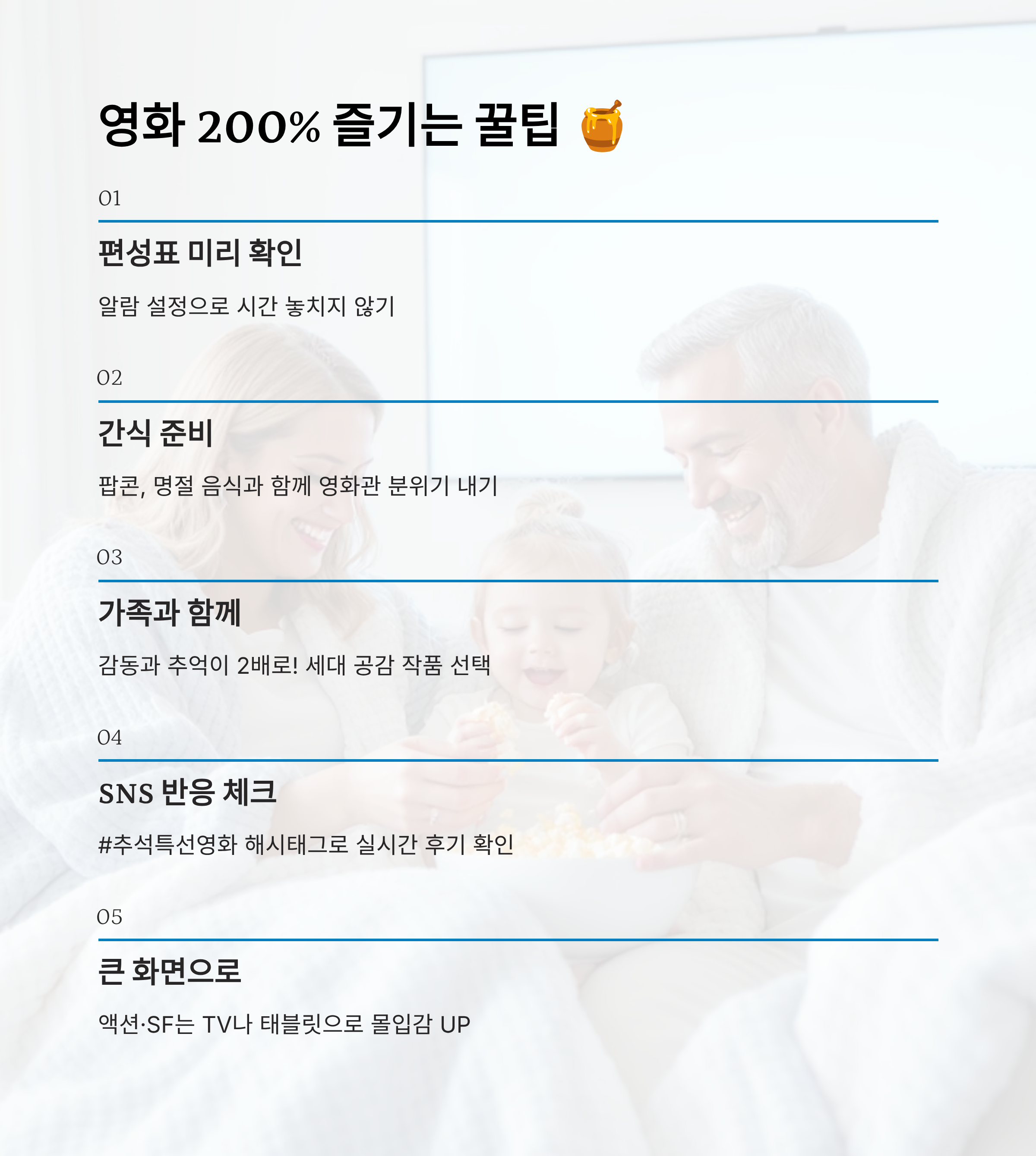 특선영화, 그냥 보기만 하면 아쉽죠? 조금만 준비하면 영화 감상 경험이 2배, 아니 3배로 즐거워질 수 있어요! 지금부터 추석 연휴 동안 영화 제대로 즐기는 꿀팁들을 소개할게요 😎
