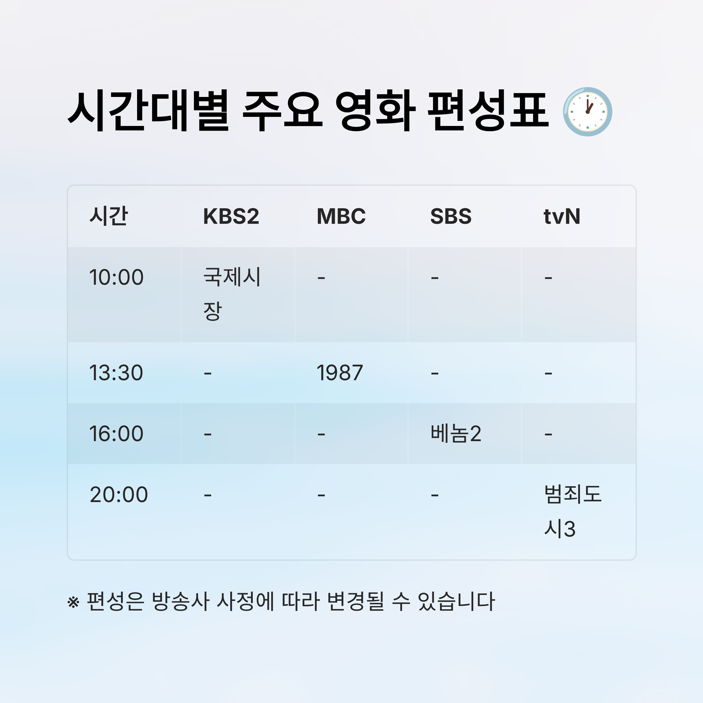 이제 시간대별로 어떤 영화들이 방송되는지, 방송사별로 한눈에 정리한 표를 통해 살펴볼게요! 👀