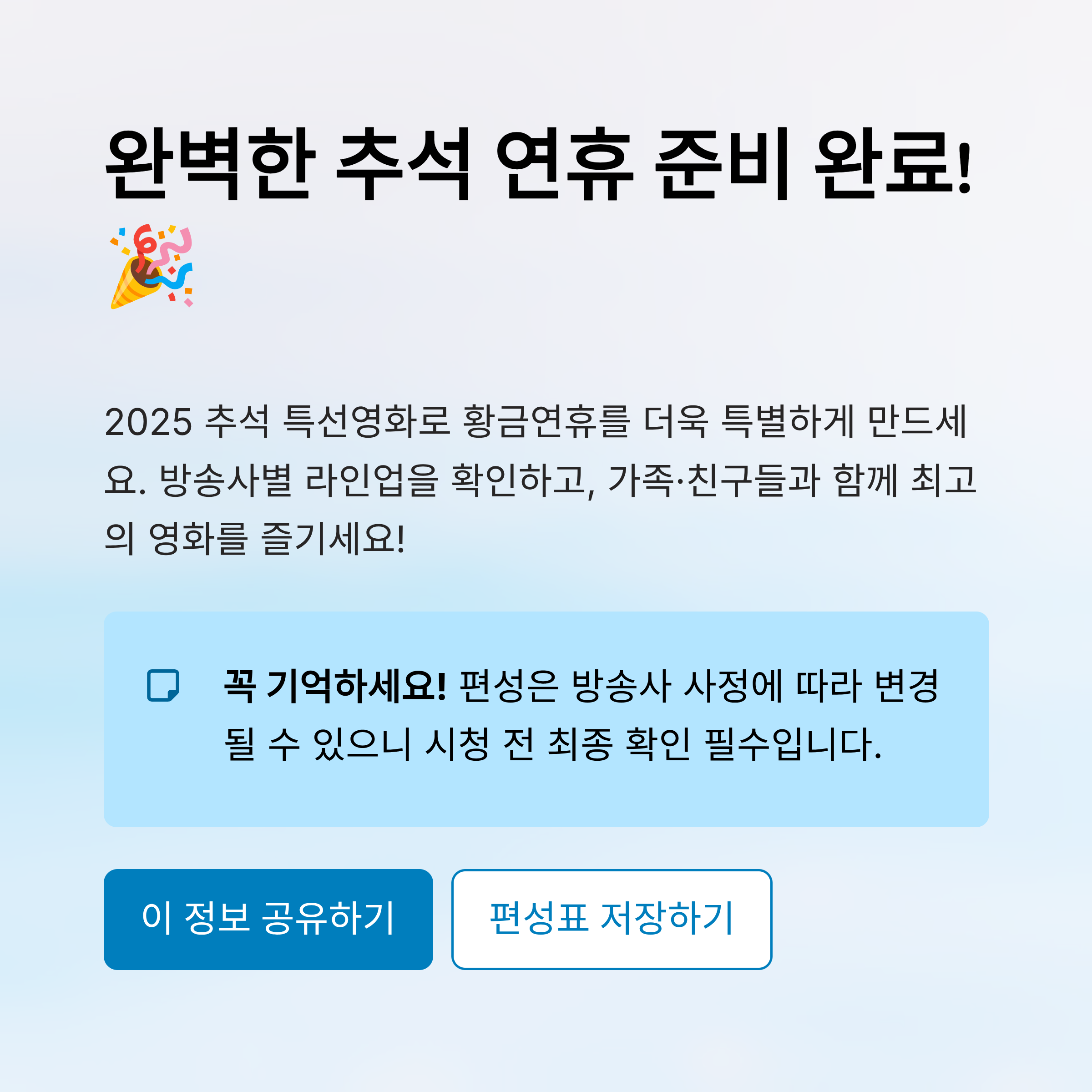 이제 어떤 영화를 볼지 선택만 남았어요! 시간만 맞춰두면, 최고의 영화와 함께 추석이 더욱 특별해질 거예요. 😍