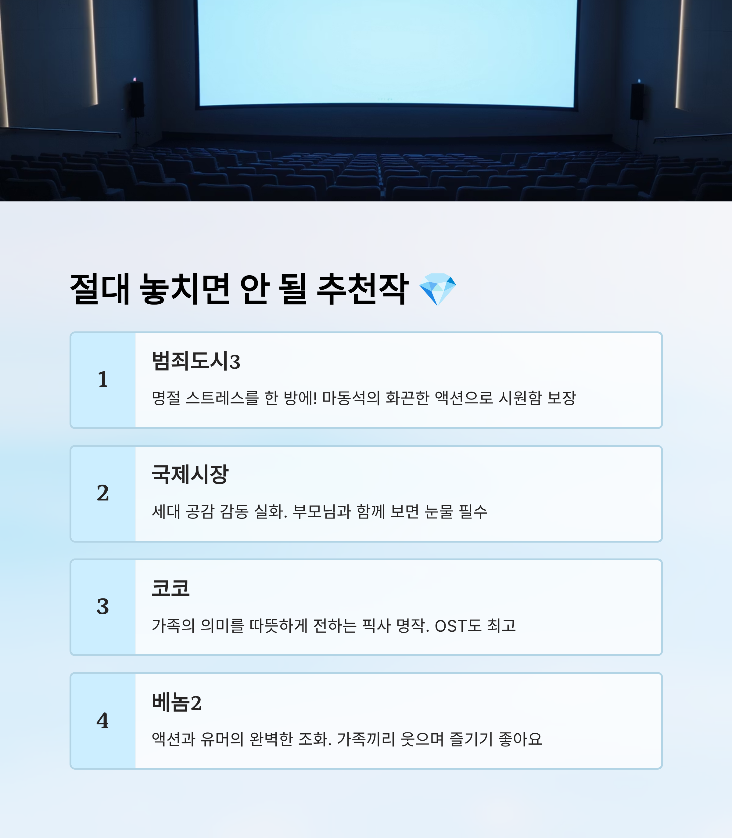 마지막 팁은 자기 스타일 찾기예요. 꼭 모든 영화를 다 볼 필요 없어요. 액션파, 감성파, 코미디 마니아 등 본인 취향에 맞는 영화만 집중해서 즐기는 것도 명절을 행복하게 보내는 방법이죠!