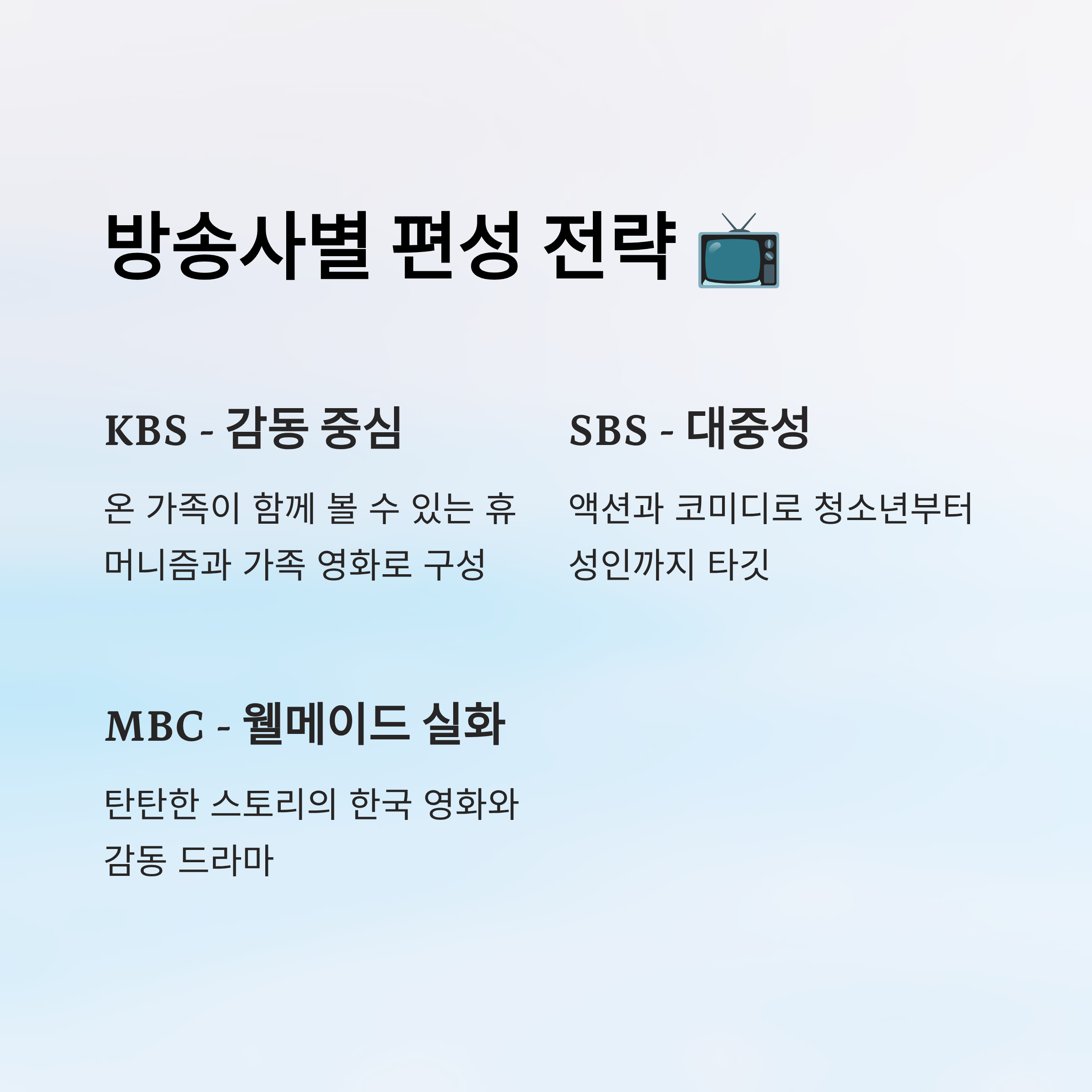특히 KBS는 국민 정서에 맞춘 가족극과 휴머니즘 중심 영화에 집중했고, SBS는 액션, 코미디 등 대중적인 장르로 라인업을 꾸렸어요. MBC는 감동 실화와 웰메이드 한국 영화 중심이죠.