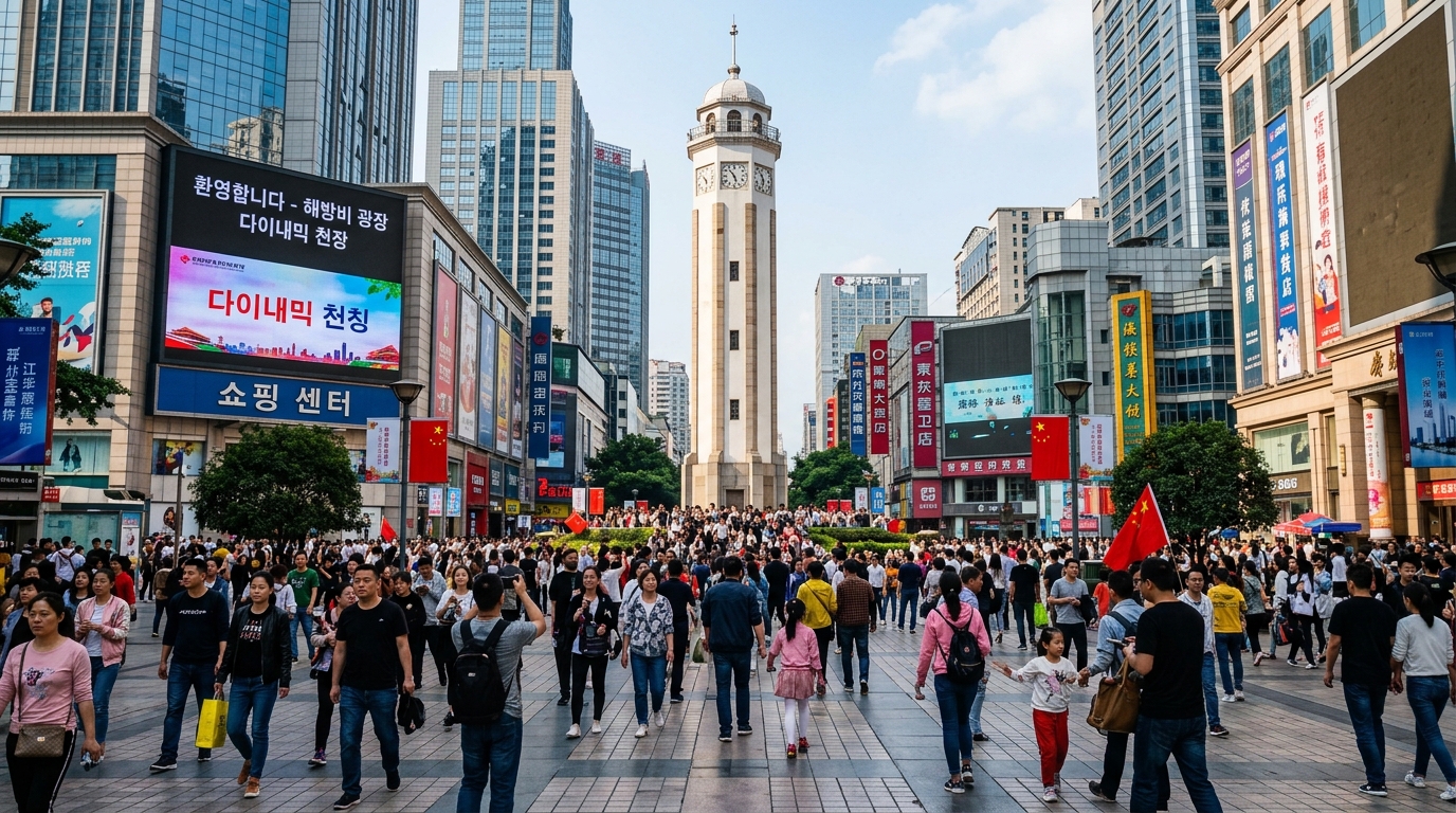 두 번째는 충칭의 심장, 해방비(Jiefangbei) 보행가입니다. 주변에 현대적인 쇼핑몰과 백화점이 밀집해 있어 쇼핑하기 좋고, '빠이치루'라고 불리는 먹자골목에서 충칭의 다양한 길거리 음식을 맛볼 수 있어요. 저는 여기서 먹은 산라분(매콤새콤한 당면) 맛을 아직도 잊지 못합니다. 😊