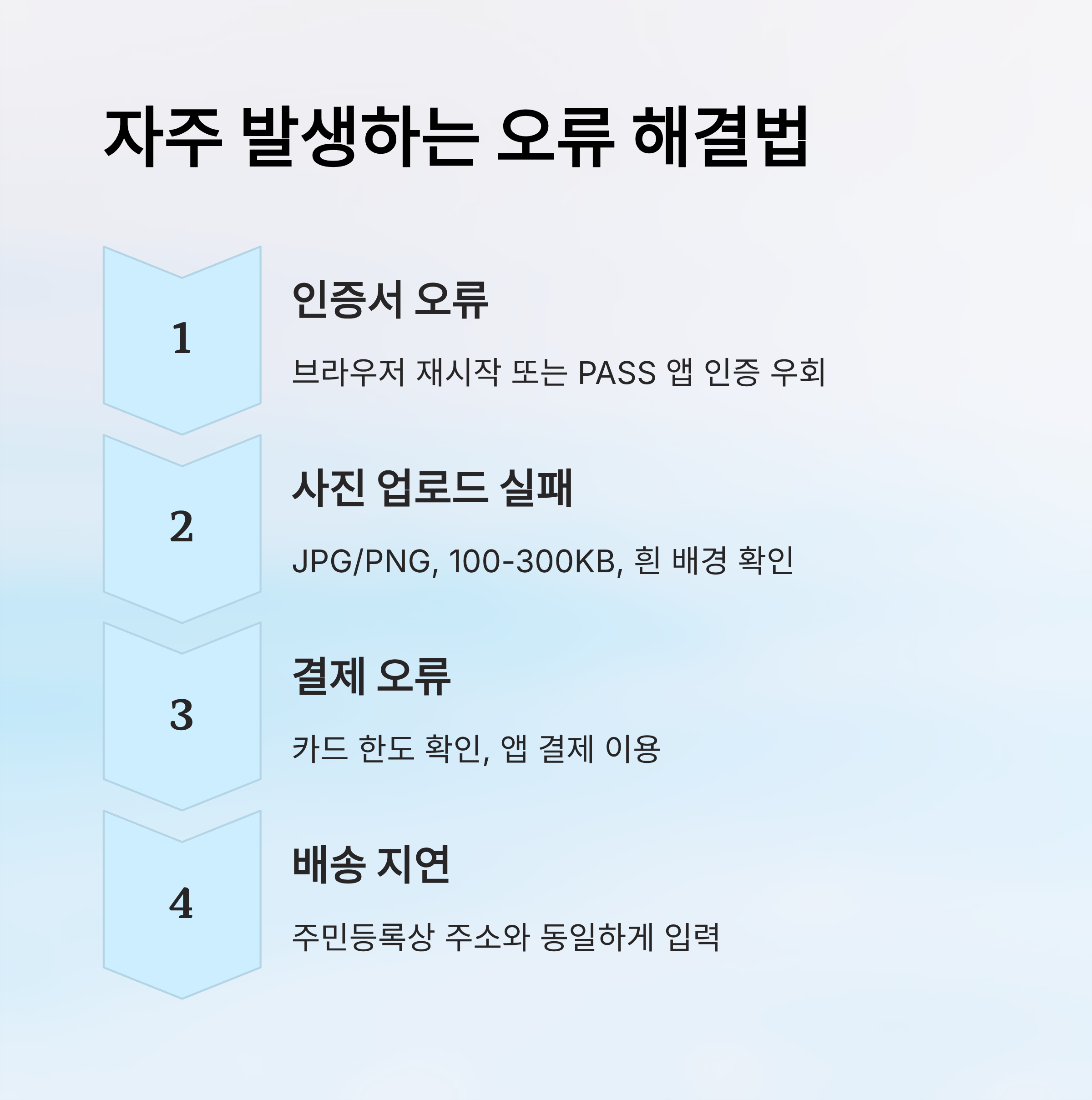 ② 사진 업로드 실패: JPG 또는 PNG 형식인지, 용량이 100KB~300KB 범위인지 확인해요. 배경색이 흰색이 아닌 사진은 거부될 수 있어요.
