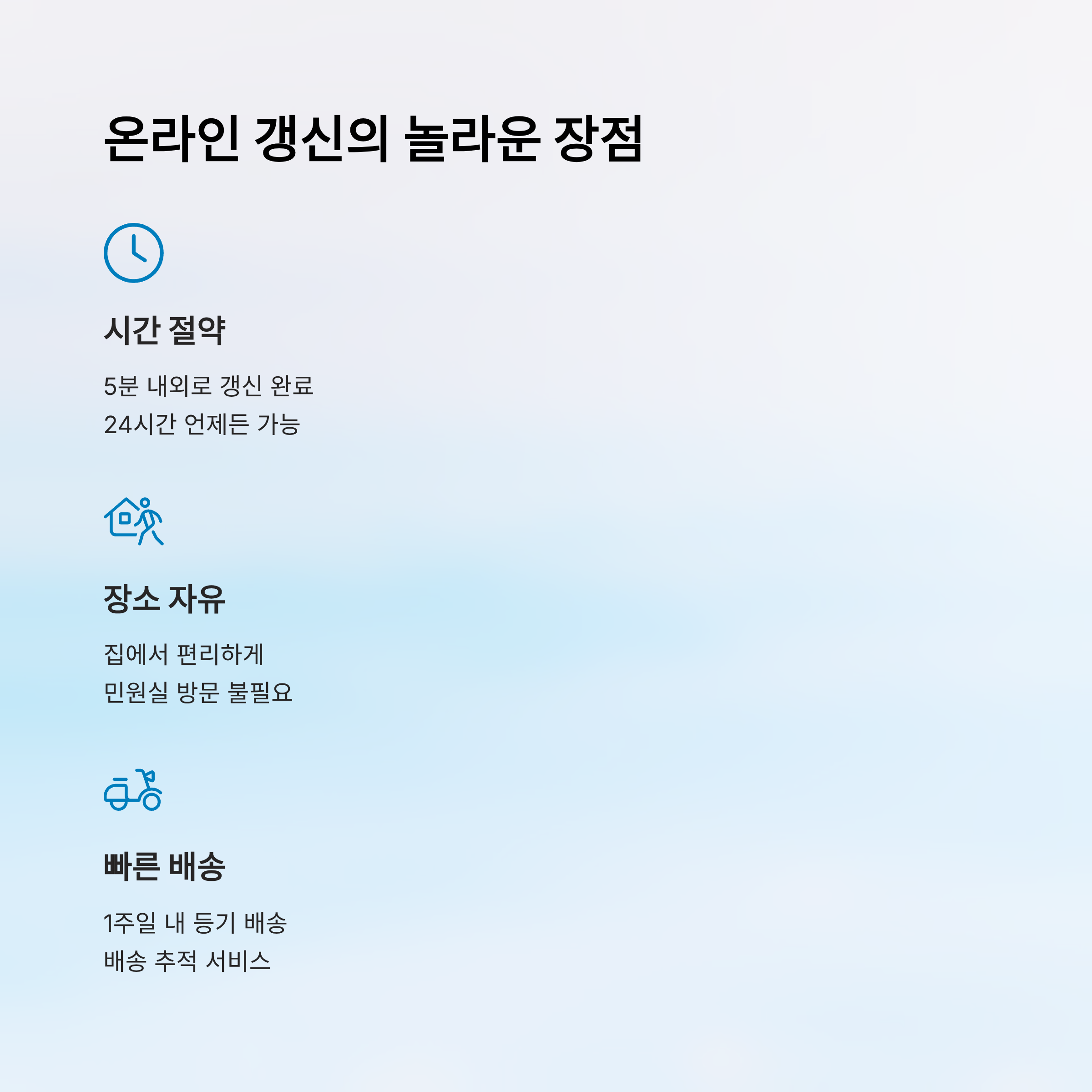 이렇게 보면 온라인 갱신은 시간, 장소, 편의성 모든 면에서 탁월하다는 걸 알 수 있어요. 특히 모바일로도 가능한 점은 요즘 같은 스마트시대에 완전한 장점이에요! 👏