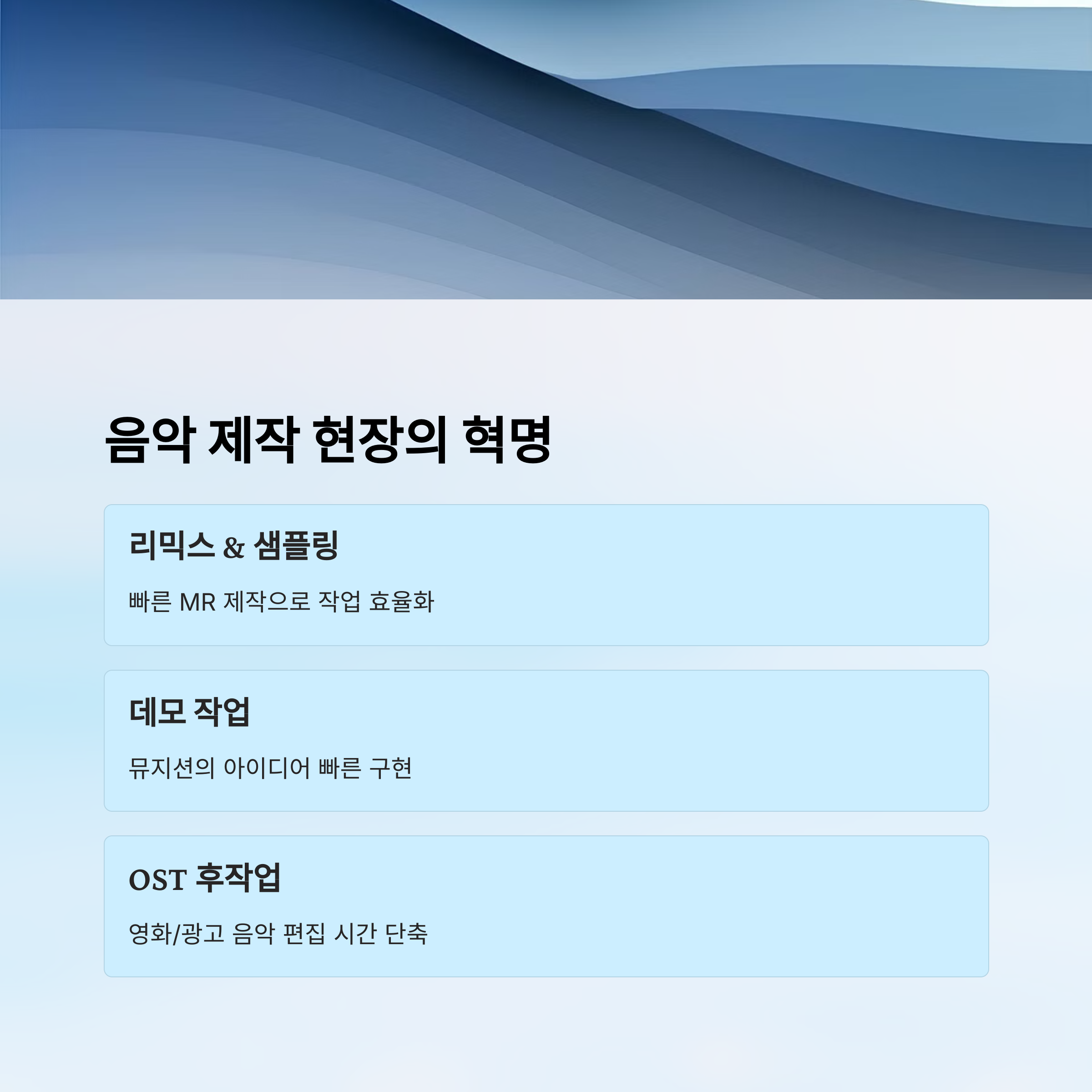 기존 소프트웨어는 수작업 비중이 크고 결과가 일정하지 않지만, AI는 오히려 처리 속도도 빠르고 음질도 유지되기 때문에 제작 효율이 크게 높아졌어요. 특히 단순 MR 제작뿐 아니라 리믹싱, 음향 분석 등 다방면에 활용되며 그 영역을 넓혀가고 있어요.