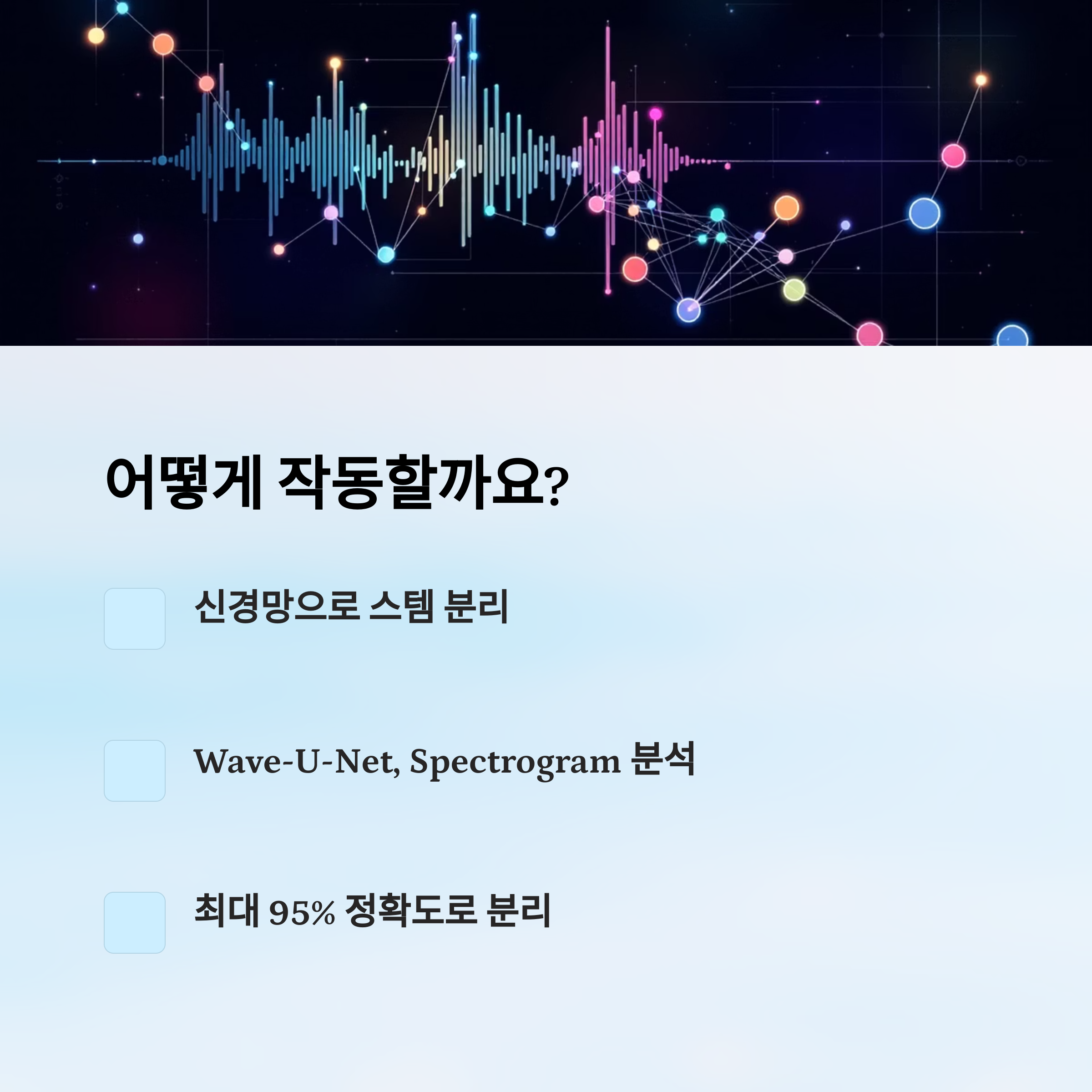보컬의 특징적인 주파수 대역과 음질, 톤, 리버브 등을 학습한 AI는 수많은 음원을 분석하며 성능을 점점 개선해가요. 그 결과, 고음질의 깔끔한 분리가 가능해졌죠. 🎛️