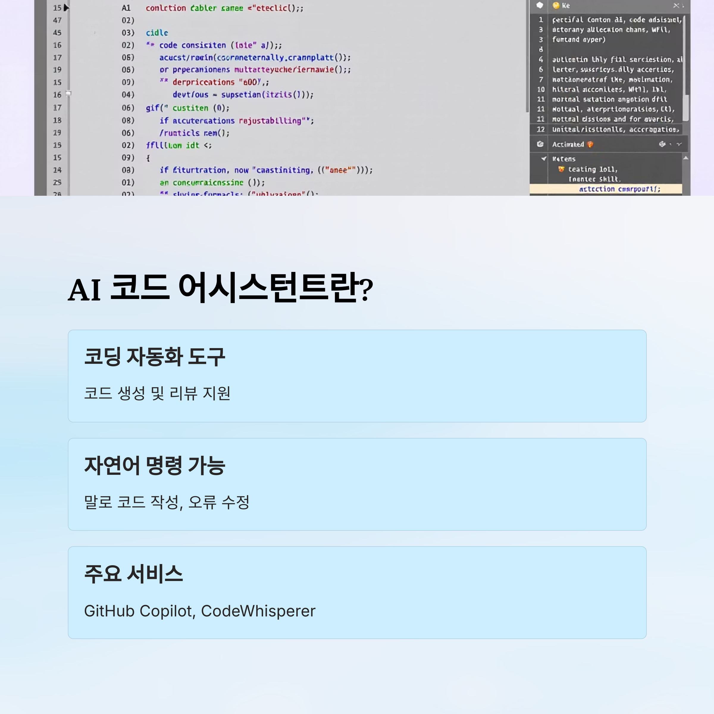 | 기능 범위 | 자동완성, 문법검사 | 코드 생성, 버그 탐지, 리팩토링 제안 |