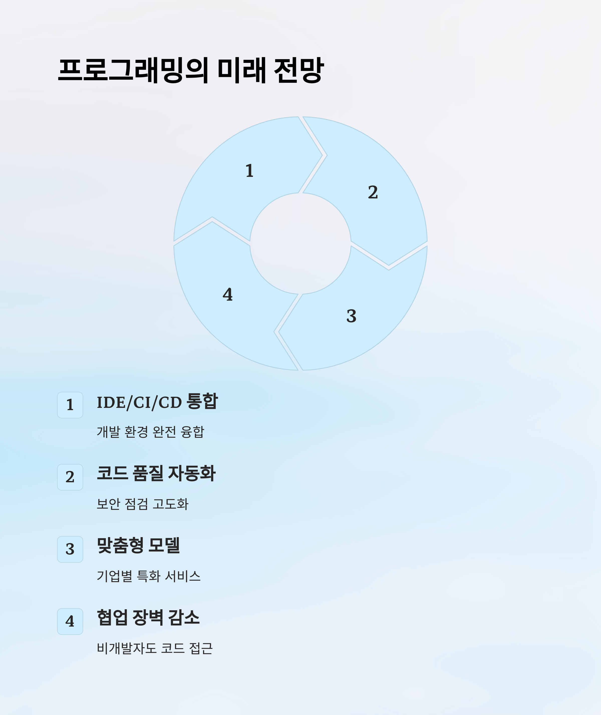 AI 코드 어시스턴트는 이제 막 시작된 기술이에요. 앞으로의 전망은 정말 무궁무진하답니다. 현재는 코드 생성과 추천 위주지만, 곧 복잡한 설계부터 자동화된 테스트, 배포까지 모두 AI가 주도하는 풀 사이클 개발이 가능해질 거예요. 개발자가 감독하고, AI가 실제 구현을 맡는 구조로 변해가고 있죠. 👁️🗨️