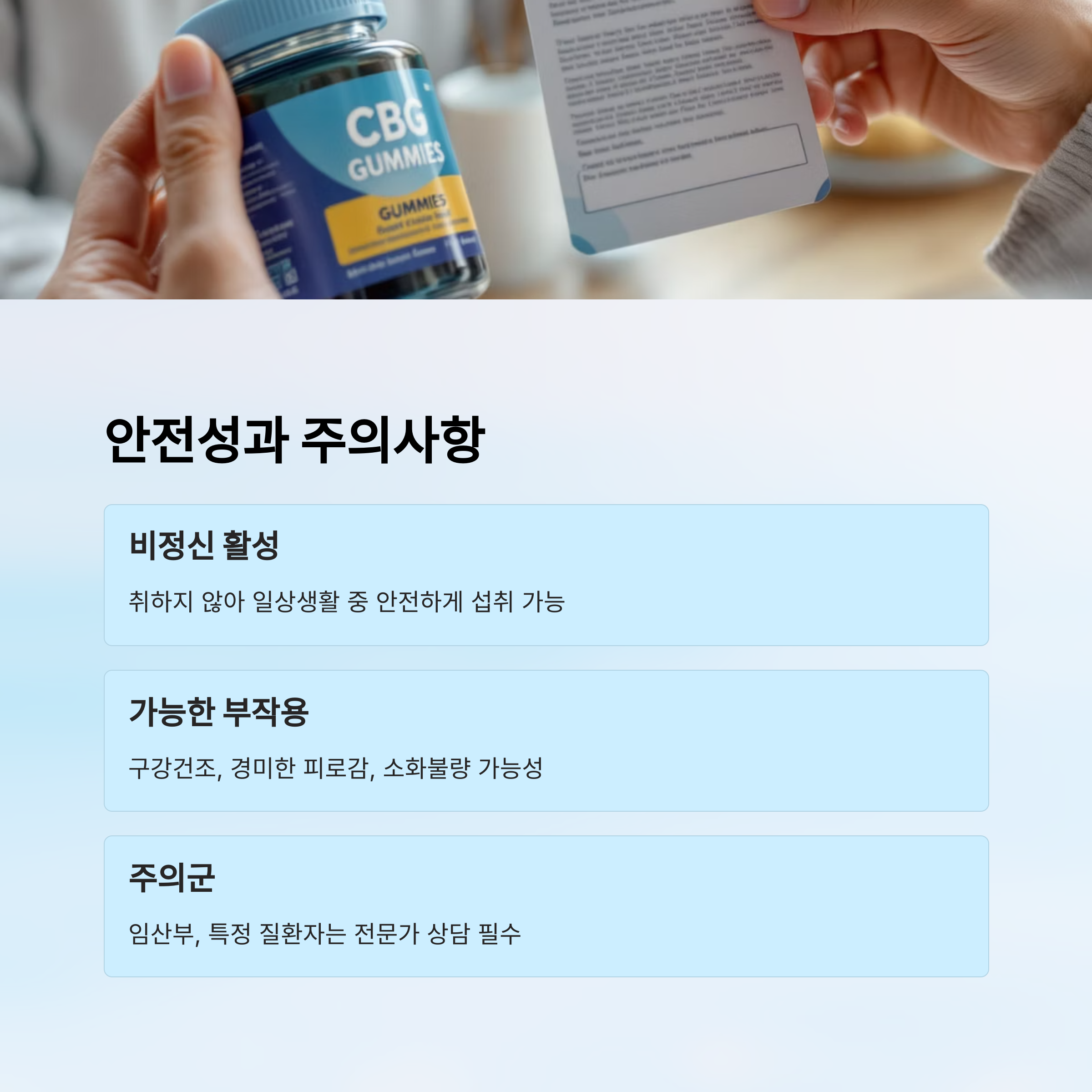 CBG는 장기적인 연구가 아직 부족한 편이기 때문에, 과도한 섭취보다는 적절한 범위 내에서 조심스럽게 사용해야 해요. 건강 보조식품이라 하더라도 본인의 상태를 고려해 복용하는 것이 가장 좋아요.