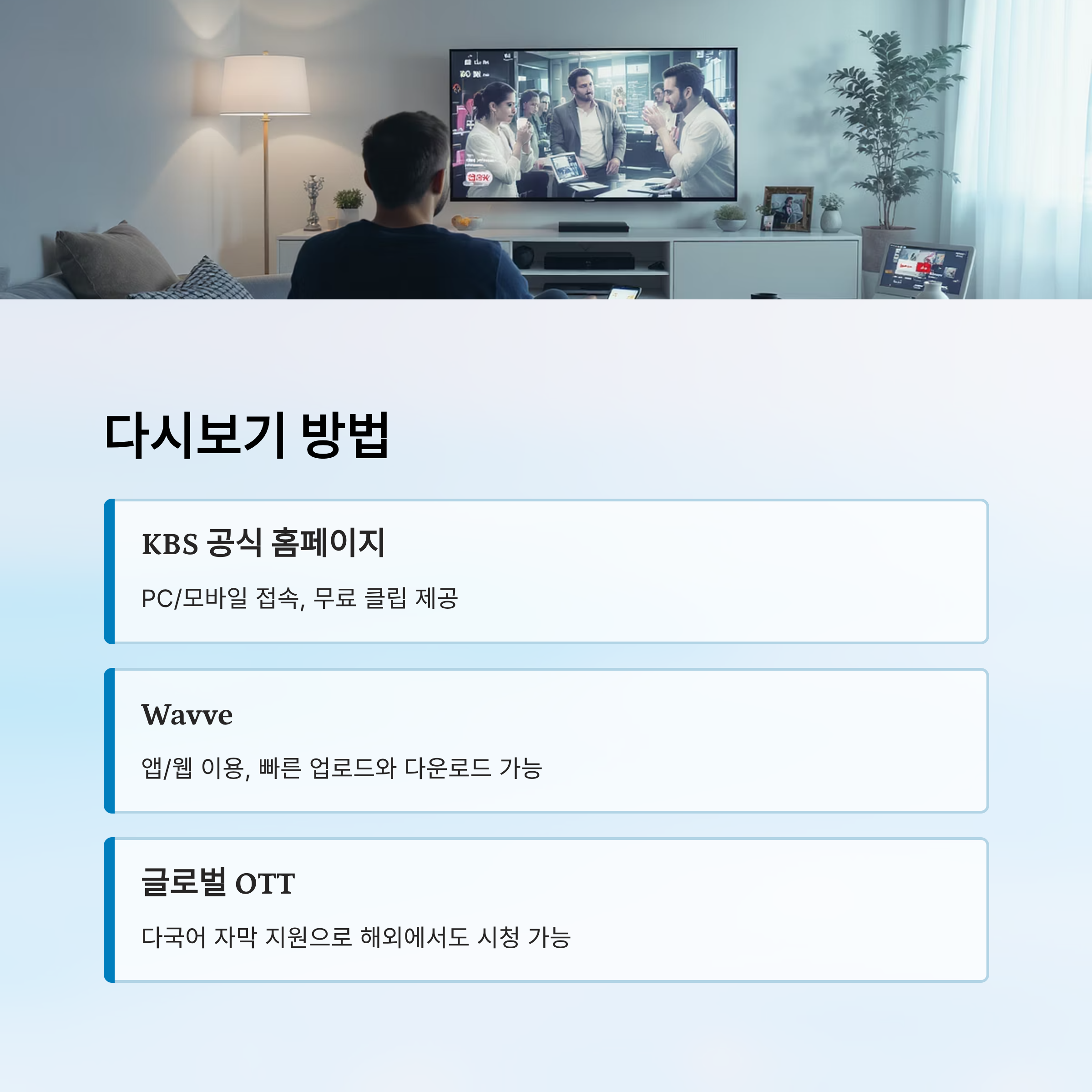 A4. KBS 공식 홈페이지와 Wavve 등 OTT 플랫폼에서 다시보기가 가능해요. 해외에서는 글로벌 OTT를 통해 자막과 함께 시청할 수 있답니다.