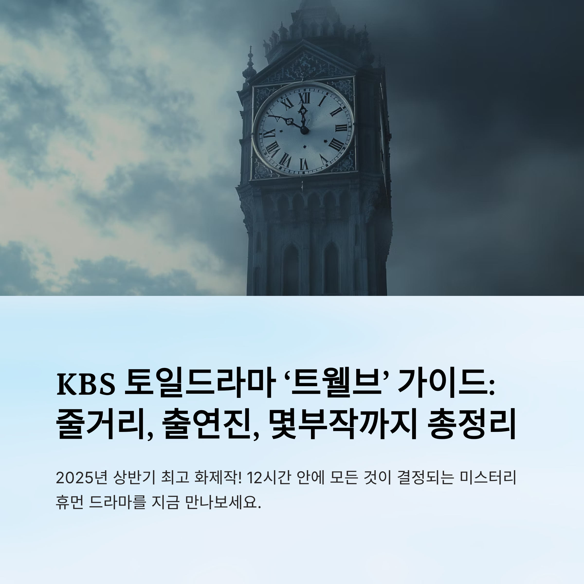 KBS 토일드라마 ‘트웰브’는 2025년 상반기 방송작 중에서도 가장 많은 관심을 받고 있는 작품이에요. 장르적으로는 미스터리와 휴먼 드라마가 결합된 형태로, 한정된 시간 속에서 펼쳐지는 인물들의 선택과 갈등을 다루고 있답니다.