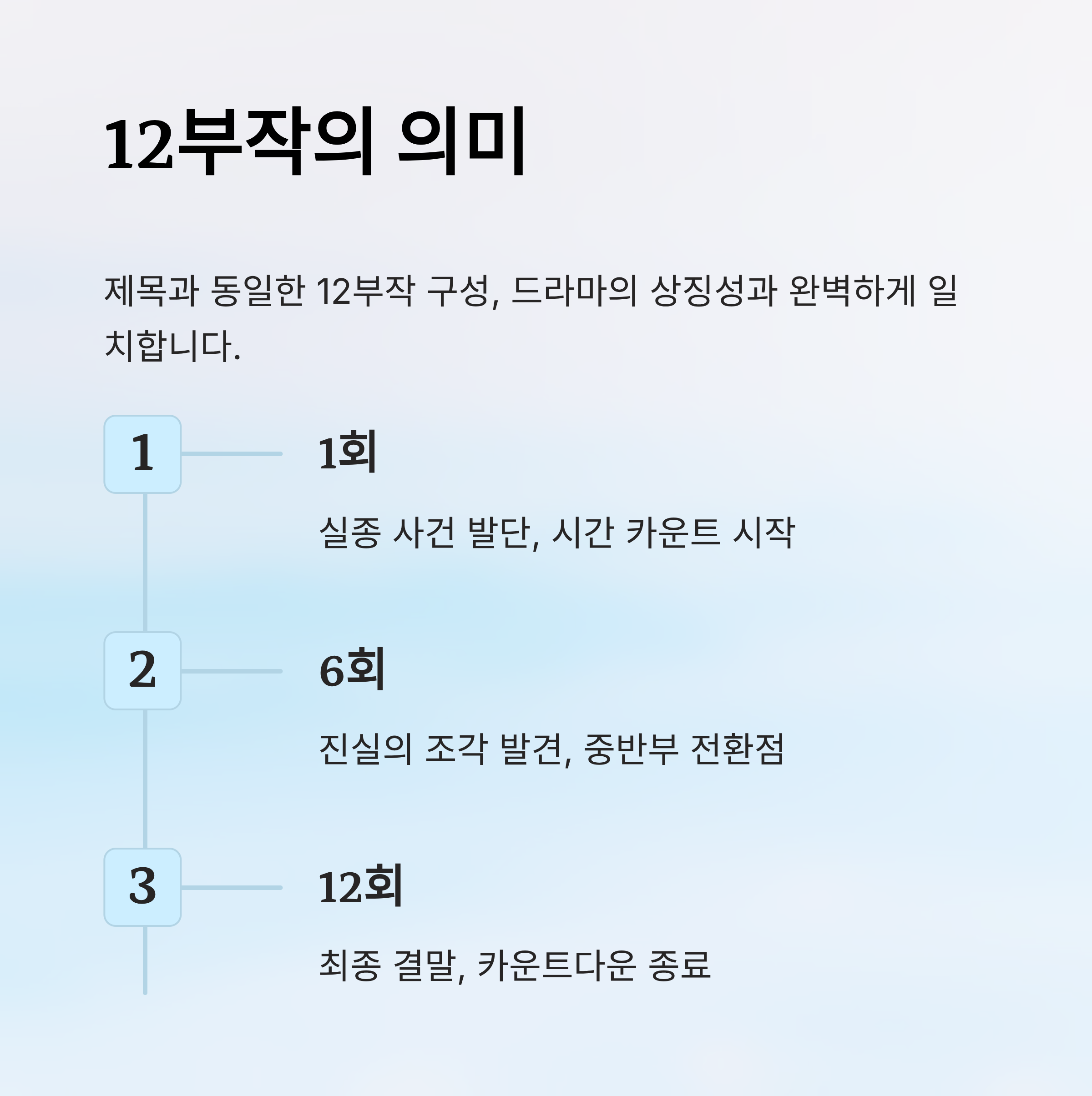 드라마 제목인 ‘트웰브’는 단순히 숫자 12를 의미하는 것이 아니라, 작품 속 사건 전개의 중요한 단서를 품고 있어요. 시청자들은 매회 방송을 통해 이 숫자가 갖는 의미를 추리하며 이야기에 빠져들게 된답니다.