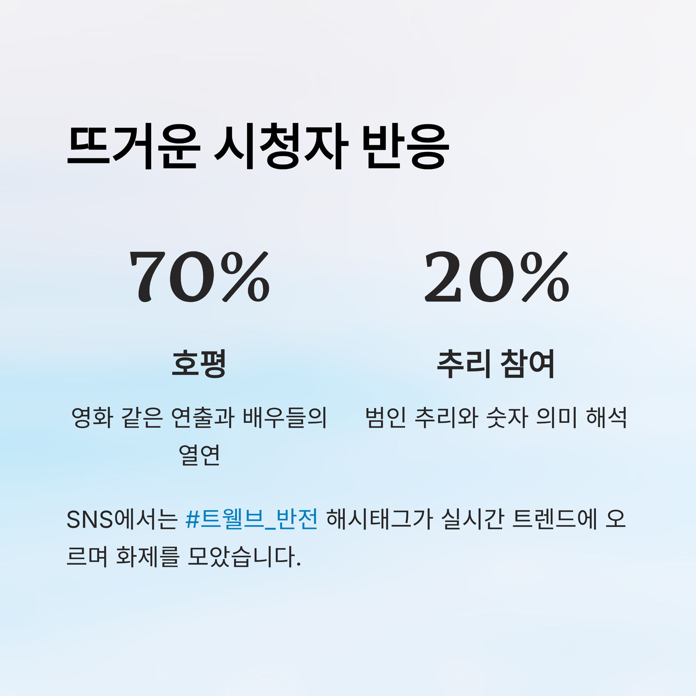 드라마 ‘트웰브’가 방송되자마자 시청자들의 반응은 뜨거웠어요. 첫 방송부터 “영화 같은 연출”이라는 호평이 이어졌고, SNS에서는 해시태그 ‘#트웰브_반전’이 실시간 트렌드에 오르기도 했답니다. 특히 카운트다운 형식으로 흘러가는 전개가 신선하다는 평가가 많았어요.