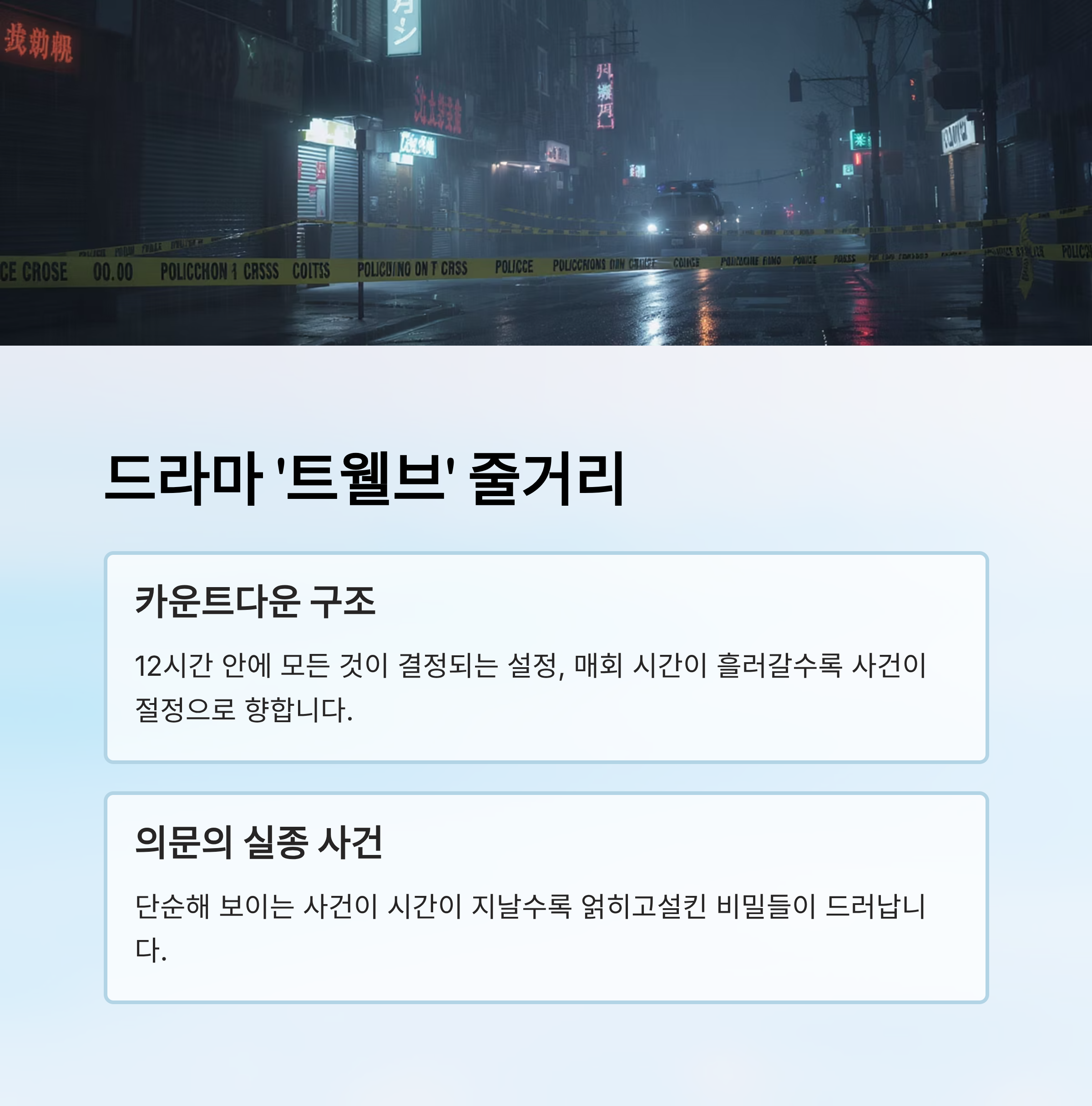 드라마 ‘트웰브’는 단순한 사건 해결극이 아니라 인간 내면의 심리를 깊게 탐구하는 작품이에요. 이야기의 중심은 ‘12시간 안에 모든 것이 결정된다’는 설정에서 시작돼요. 주인공들은 한정된 시간 동안 각자의 선택을 내려야 하고, 그 선택은 서로의 인생을 바꾸는 결과를 만들어낸답니다.
